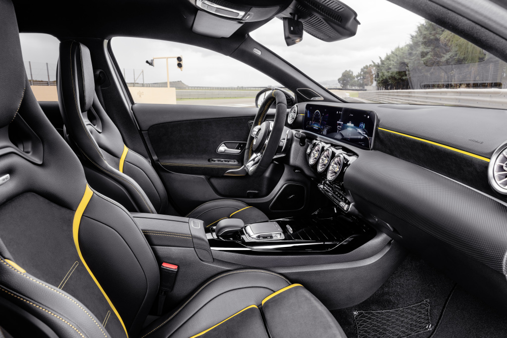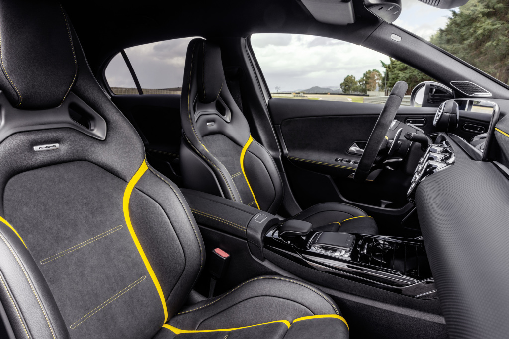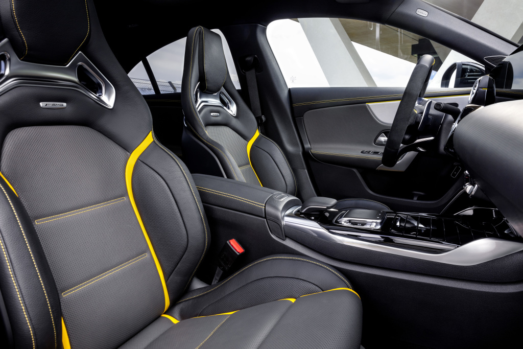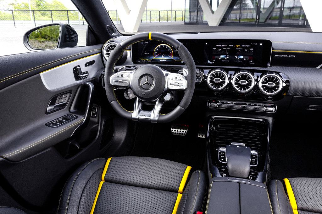The A 45 S and CLA 45 S even go a step further: yellow highlights reoccur throughout the interior to emphasise the motor racing character of the more powerful models. Also included in the standard equipment are the AMG Performance steering wheel in nappa leather/DINAMICA microfibre with contrasting yellow topstitching, a yellow 12 o’clock marking, AMG steering wheel buttons and AMG logo, plus ambience lighting.