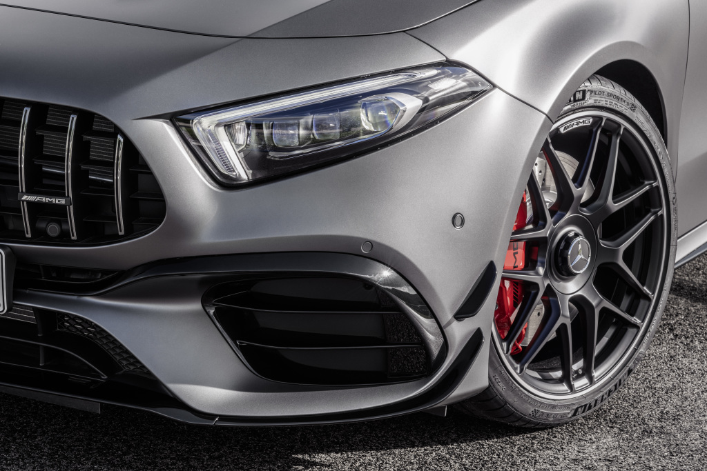 The front apron is also a distinguishing feature. In the A 45 4MATIC+ it is in a jet-wing design. Horizontal fins in the outer air inlets and the stretched lower air inlet emphasise the impression of width. The CLA 45 4MATIC+ has an even more expressive appearance with its jet-like external air inlets, showing its close family relationship with the AMG GT 4-door Coupé. The front splitter transitions seamlessly into the side air curtains ahead of the front wheels, which optimise the airflow to improve aero-performance and the Cd figure.