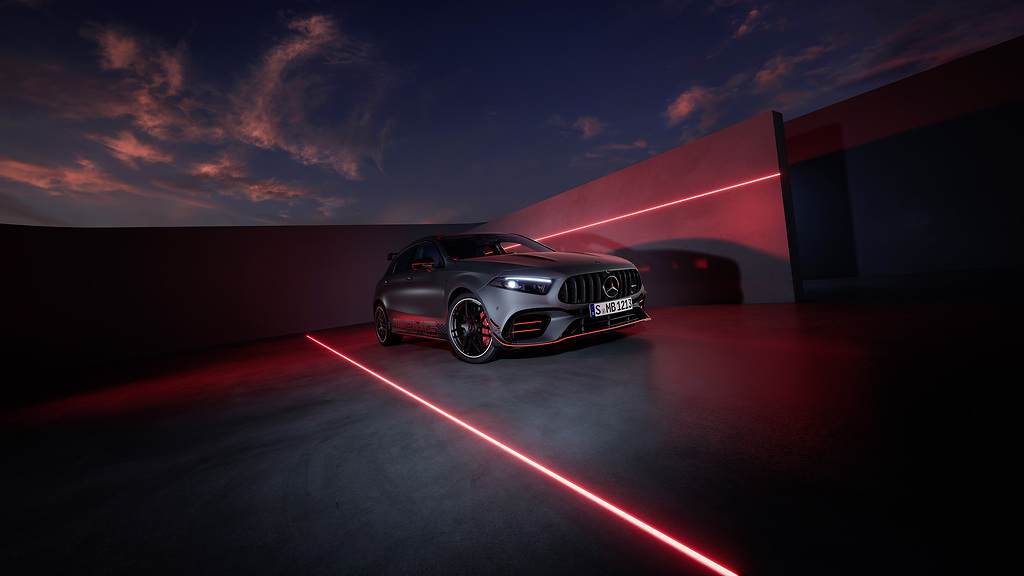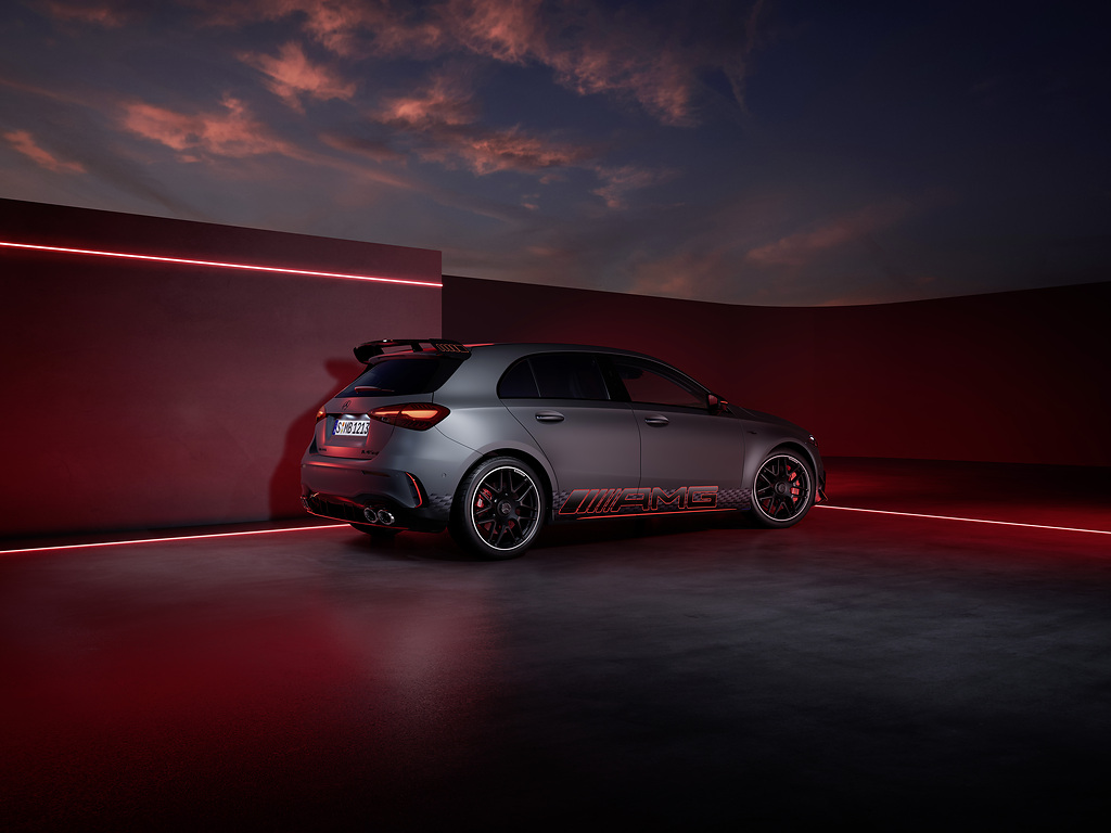 AMG Street Style Edition: For the market launch of the new Mercedes-AMG A-Class, a very special version of the Mercedes-AMG A 45 S 4MATIC+ will also be available exclusively and for a limited time: The AMG Street Style Edition impresses with extrovert and exclusive equipment elements. With the base paint in mountain grey magno and the edition-specific foiling with colour gradient in black/anthracite matt and colour accents in fluorescent orange, it emphasises the elements of the Aerodynamics Package. The look is perfectly complemented by the newly designed 19-inch wheels in matt black and the bright red brake callipers.