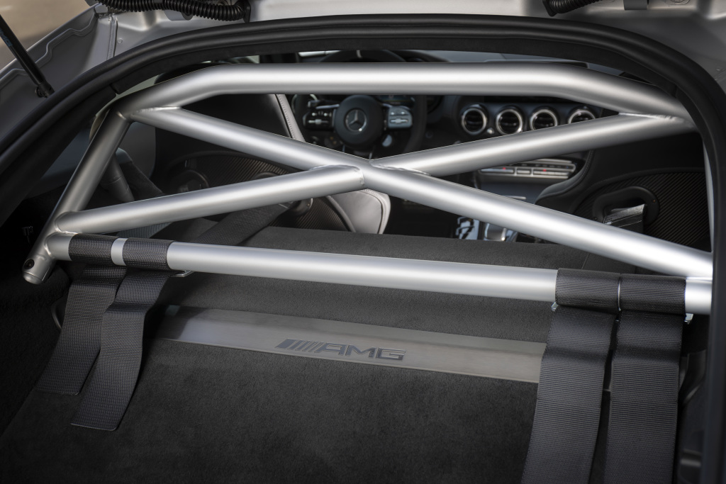 Optional AMG Track package, including roll-over protection system behind the seats and 4-point seat belts.