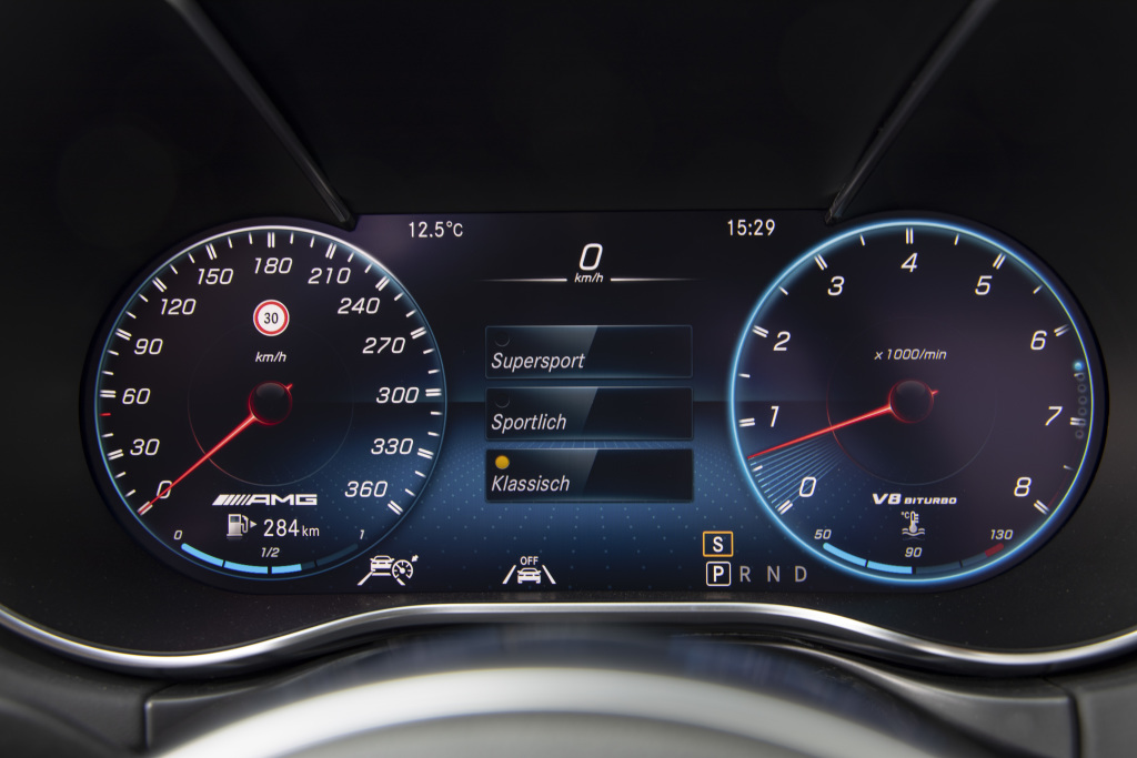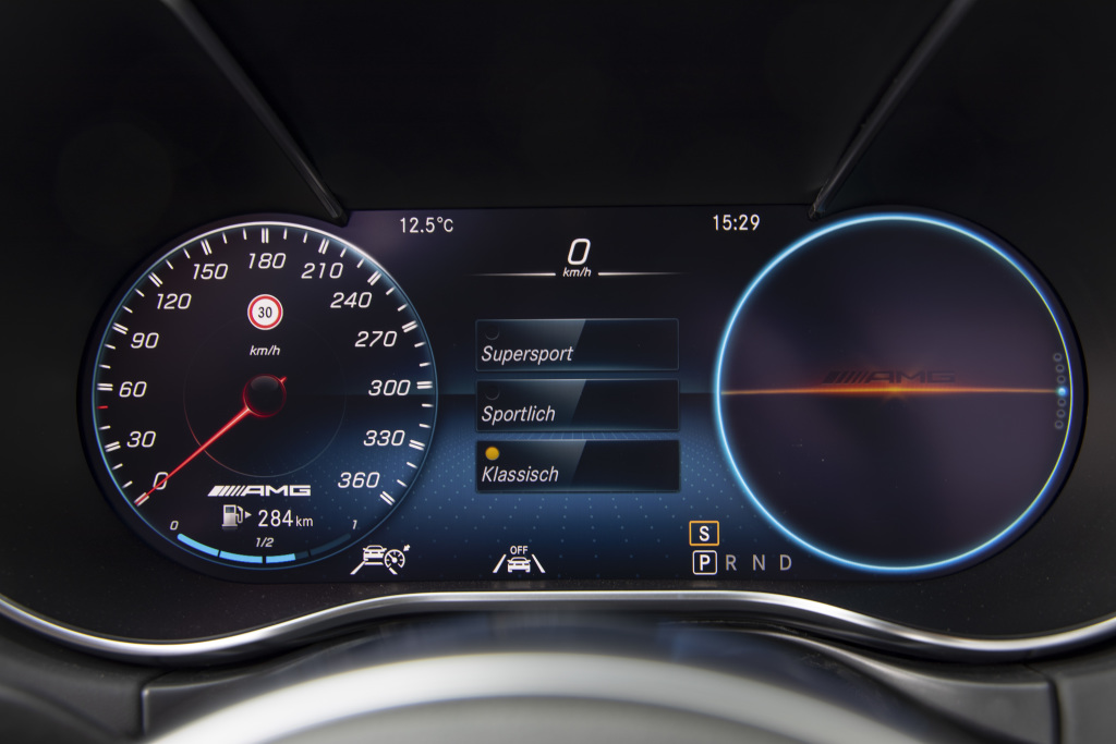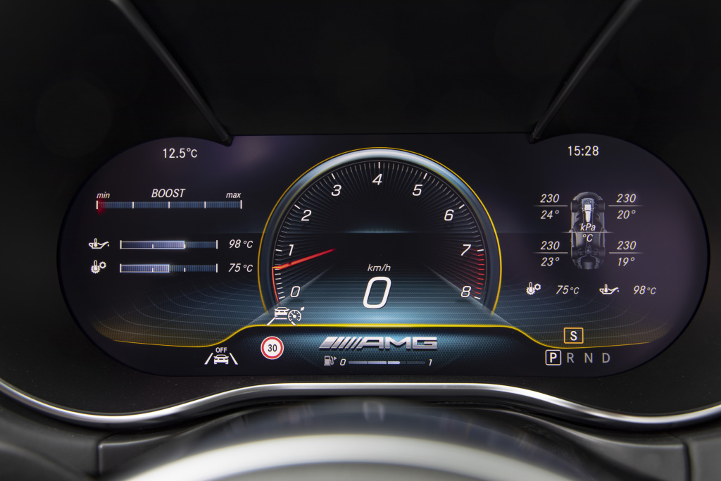 The cockpit is dominated by the wing profile of the instrument panel support and the AMG DRIVE UNIT in the centre console. The latter incorporates the key AMG-specific controls in a stylised V8 layout as innovative display switches. The AMG sports seats and the AMG Performance steering wheel in nappa leather feature as standard from the entry-level model up.
