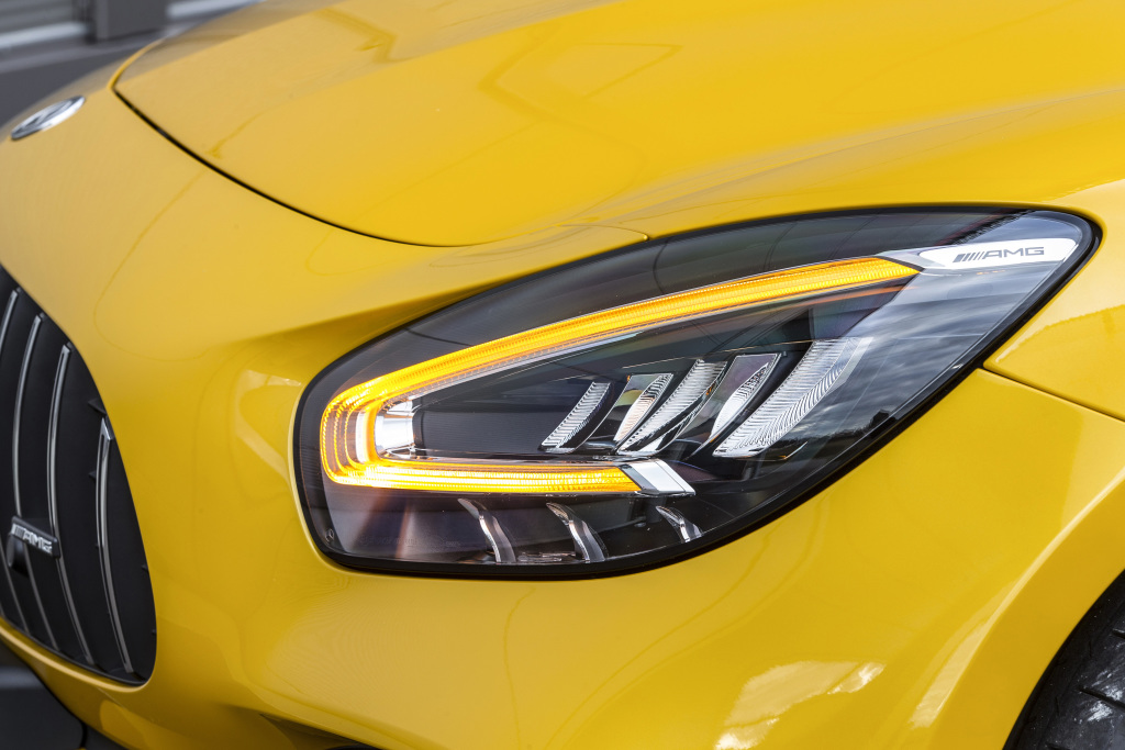 The basic layout of the AMG GT portfolio with its front mid-engine concept and transmission in transaxle configuration at the rear axle enables an advantageous slightly rear-biased weight distribution. In conjunction with the vehicle’s low centre of gravity, this translates into extremely agile handling and permits high cornering speeds. The AMG 4.0-litre V8 biturbo engine delivers ample power right from the low rev range and enables outstanding performance. At the same time, the two-seater is a straightforward, comfortable and reliable companion for everyday motoring thanks to its easily accessible luggage compartment, a high level of comfort on long journeys and the extensive Mercedes-Benz Intelligent Drive assistance systems.