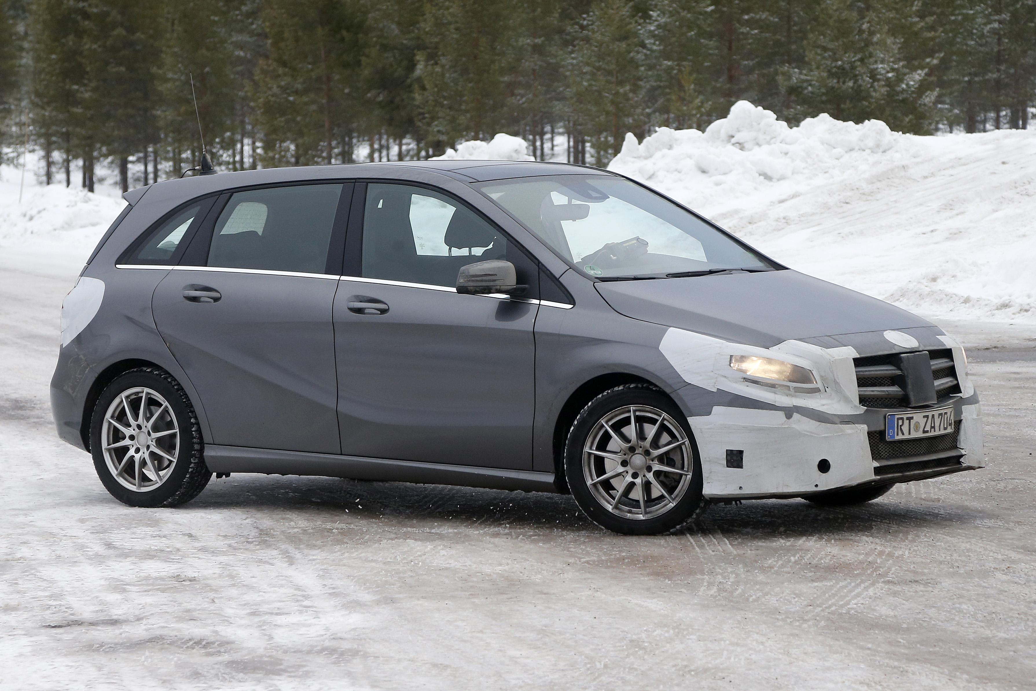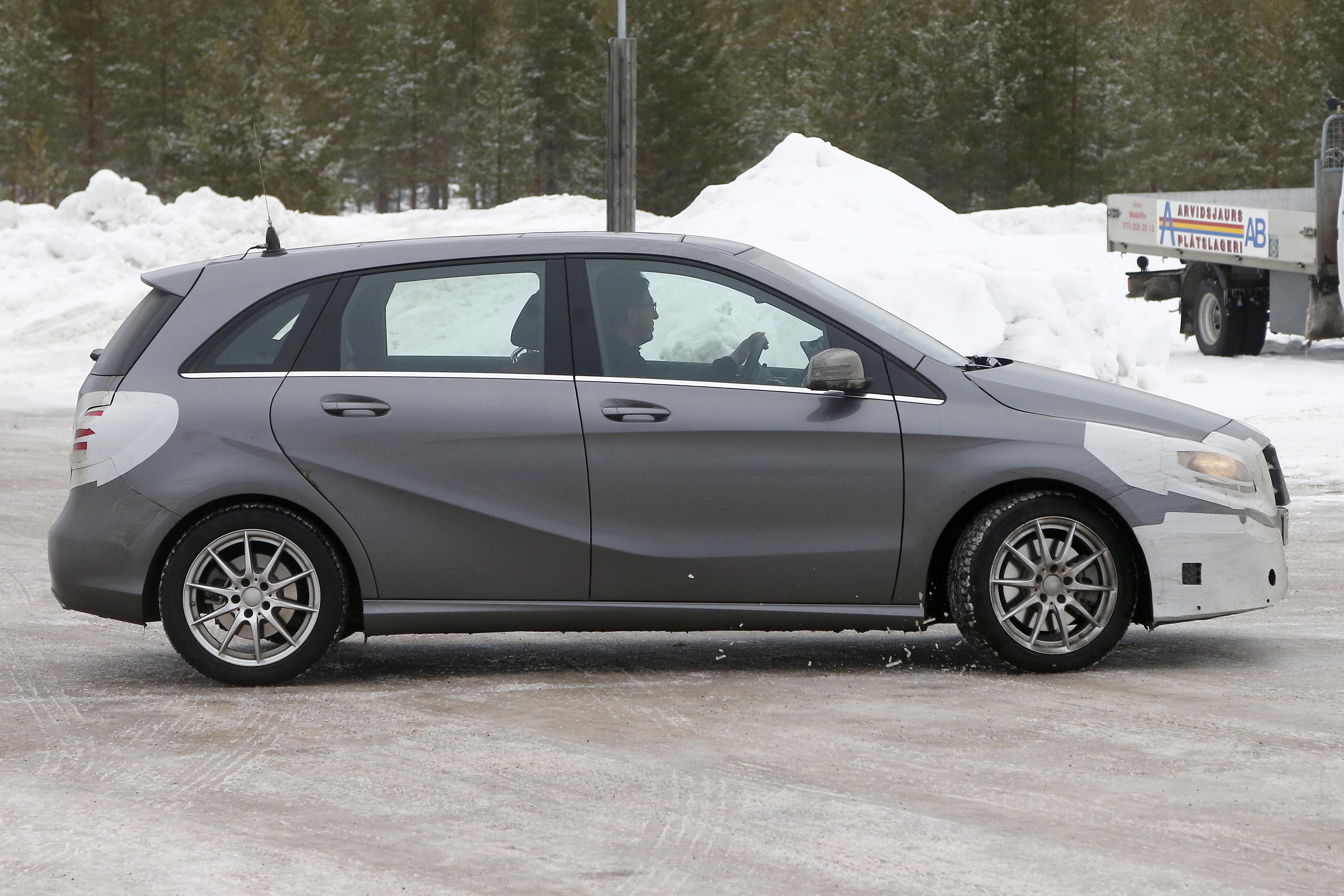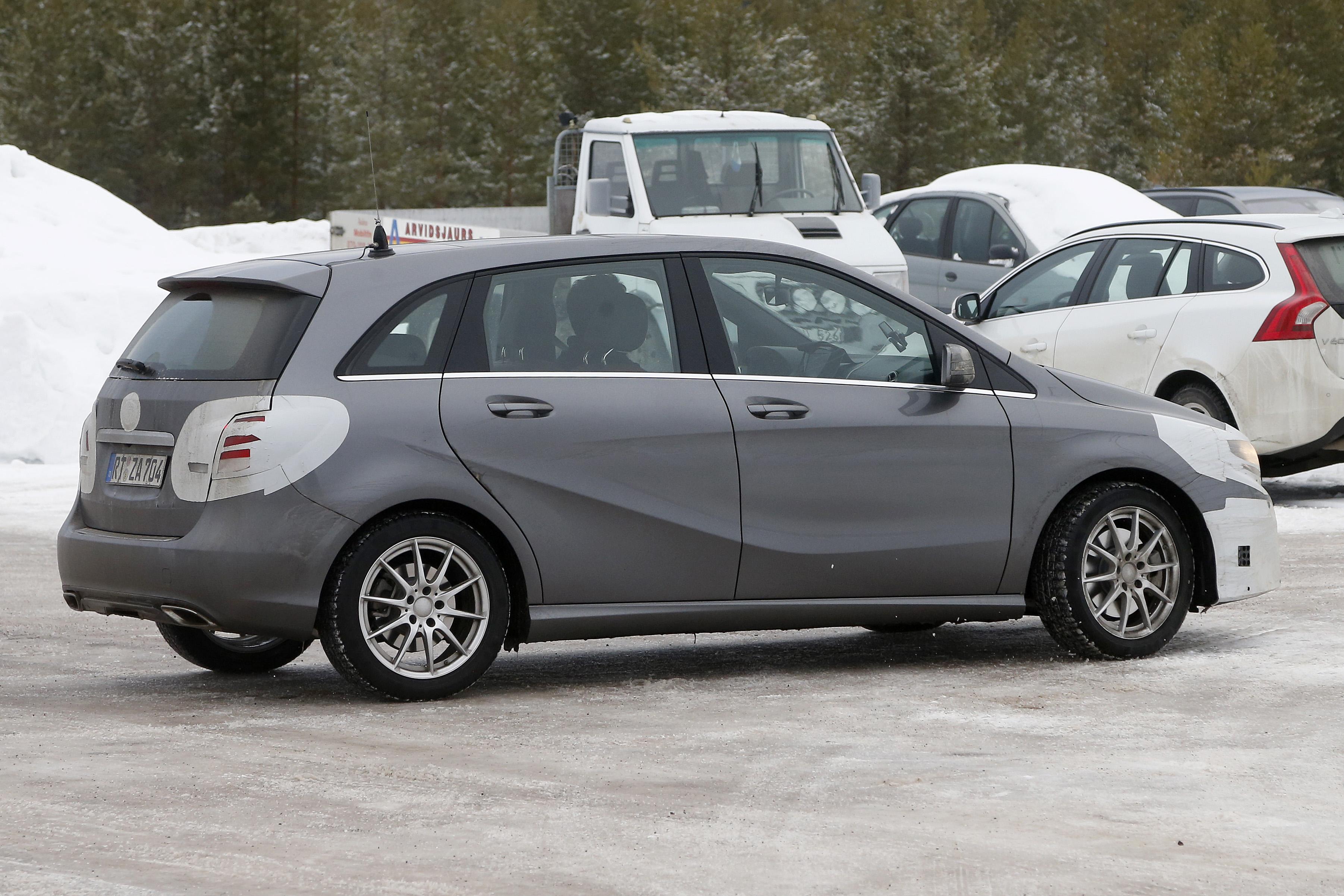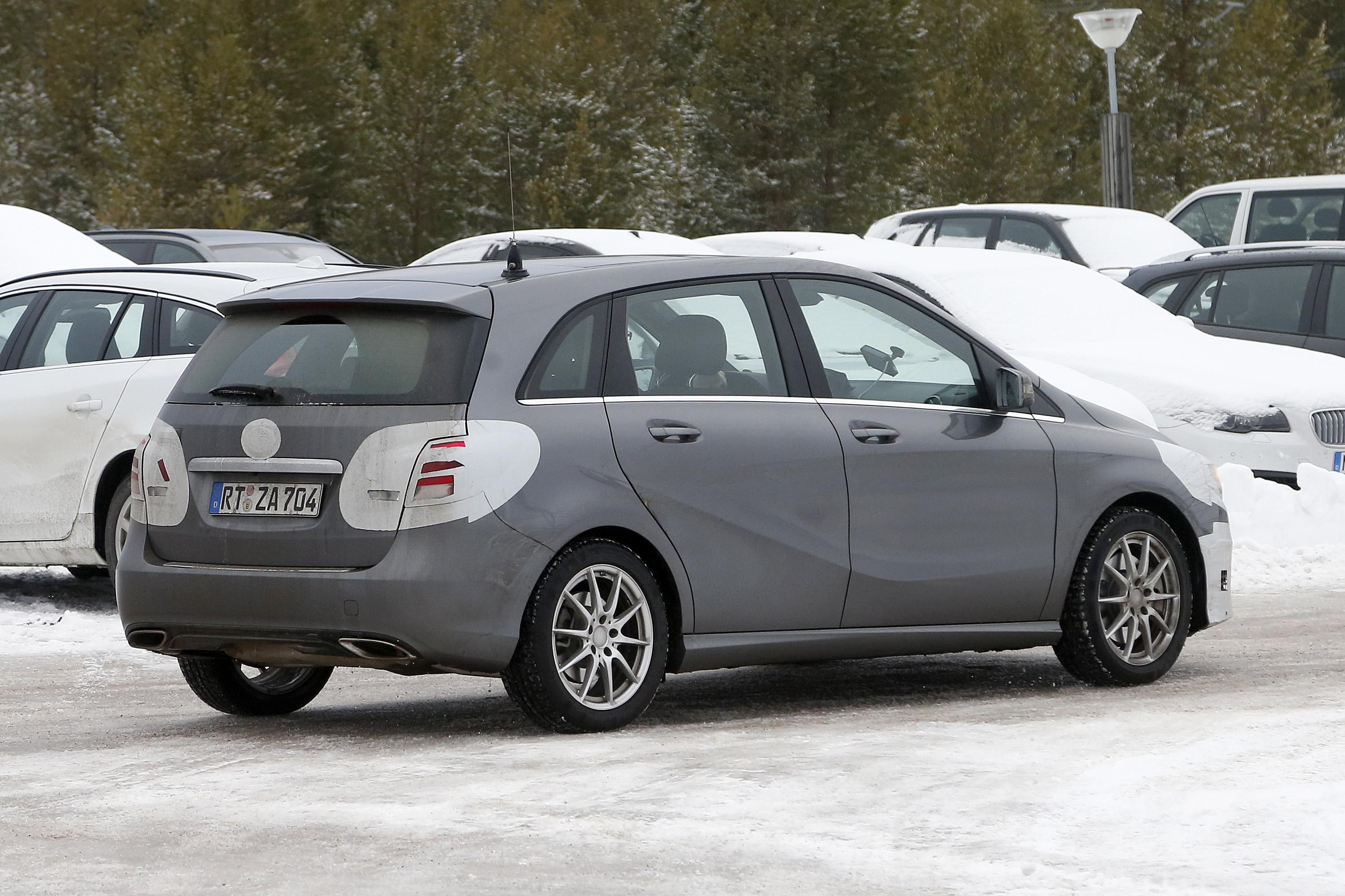 Spied doing a bit of cold weather testing, the updated B-Class looks to have an updated front bumper, grille, head and taillights. If you look at the rear photos of the bumper, you can also see a more integrated exhaust system.
