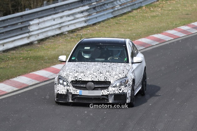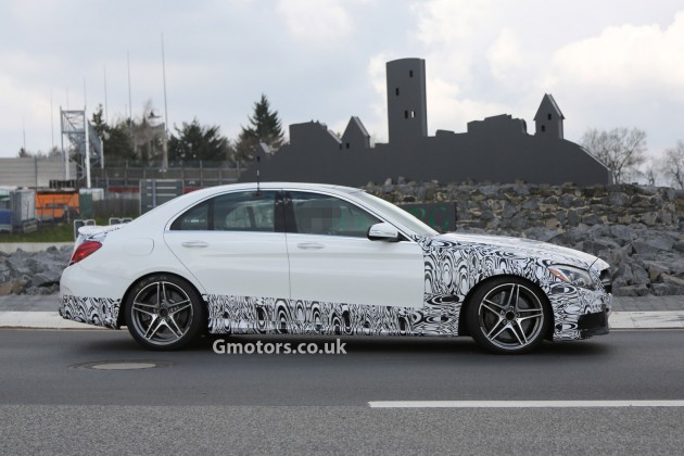 Testing for the 2015 Mercedes C63 AMG has moved South, previously caught winter testing in the Arctic, the C63 AMG is now showing off on the Nürburgring. Still sporting similar amounts of camo as in Sweden, you can still catch a glimpse of the C63 AMG Saloon’s new bumpers, bonnet, side skirt, spoiler and boot lid. And of course the prominent black alloys.