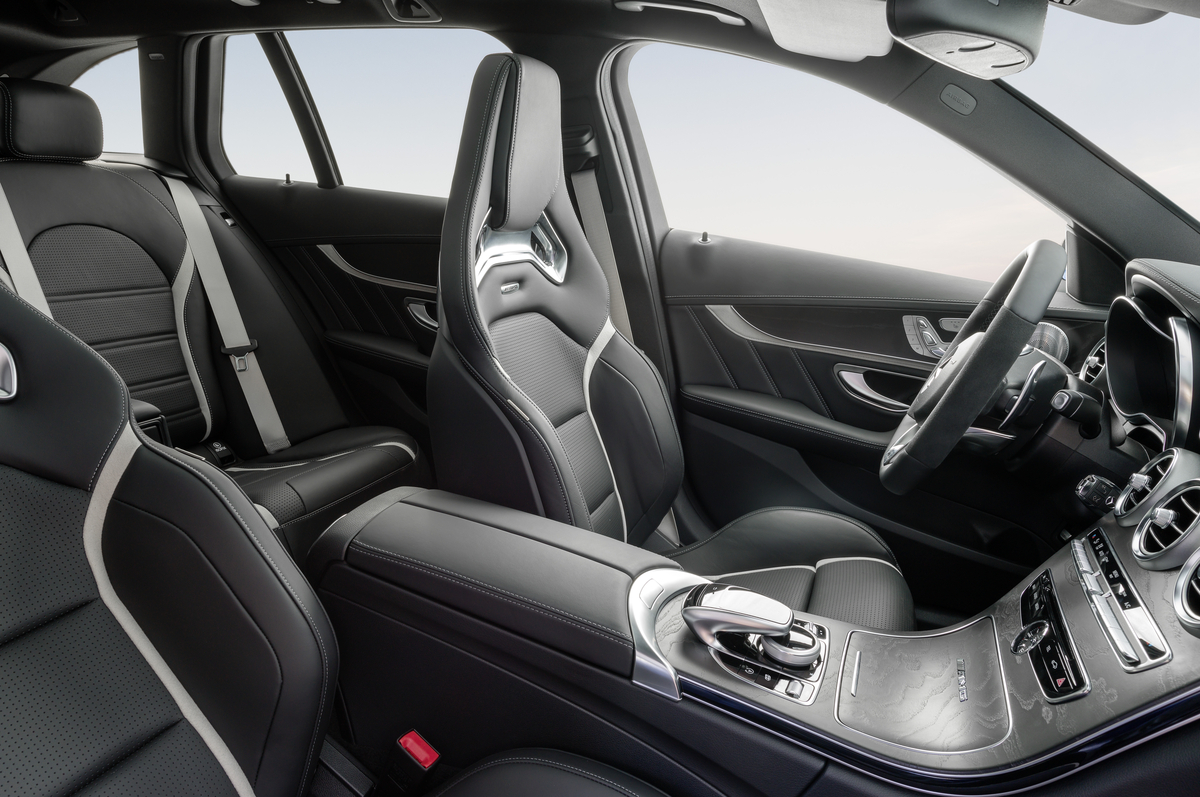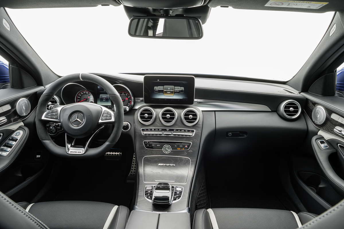 Standard equipment includes a hand-built AMG V8 engine, Burmester Surround Sound system, KEYLESS-GO, Collisions Prevention Assist Plus (with autonomous braking in emergency situations), ATTENTION ASSIST driver drowsiness monitor, AMG SPEEDSHIFT MCT 7-Speed Sport Transmission with multiple shift modes, AMG DYNAMIC SELECT, Touchpad, SIRIUS Satellite Radio, Rear Limited Slip Differential (C63 is mechanical while C63 S is electronic), Power/heated/memory seats, AMG Dynamic Exhaust, AMG Adaptive Suspension with 3 selectable modes, AMG 3-Stage ESP system, 18″ staggered alloy wheels (C63) and 19″ staggered alloy wheels (C63 S), LED headlamps, dynamic engine mounts (C63 S only, same as the Mercedes-AMG GT S), nappa leather (C63 S only), and red brake calipers (C63 S only).