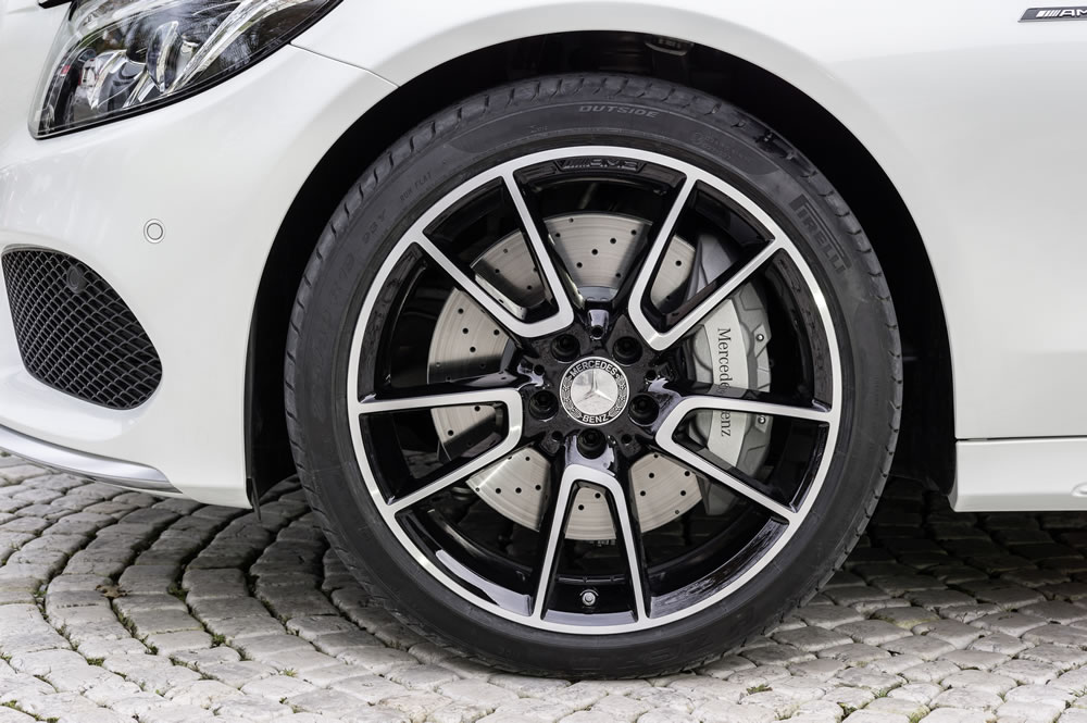 The sports braking system of the C 450 AMG 4MATIC impresses with fade-free and effective stopping power. Vented brake discs at all four corners measuring 360 millimetres in diameter at the front and 320 millimetres at the rear as well as grey brake callipers with “Mercedes-Benz” lettering are part of the standard equipment.