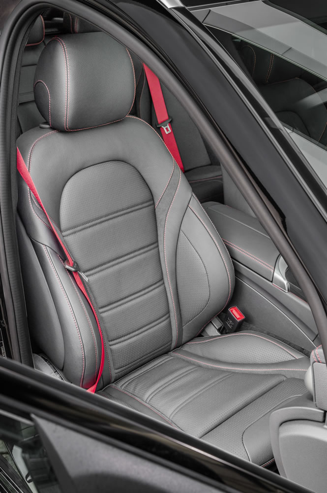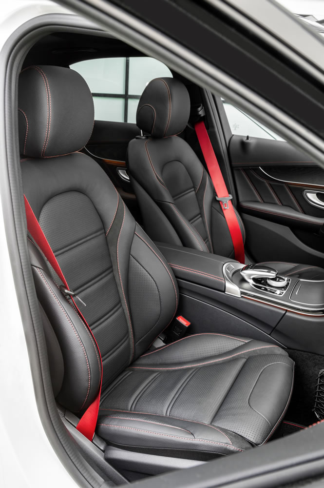 - Performance seats (lower seating position, more contoured seat shape for enhanced lateral support with integral head restraints and AMG badges)