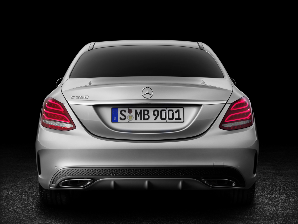 In the side view a long hood, a passenger compartment set well back and short overhangs define the C-Class’s classic, well-balanced Mercedes-Benz sedan proportions. Large wheels emphasize the rear and communicate a stylishly sporty character.