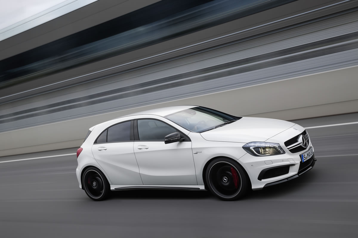 The Mercedes-Benz A 45 AMG represents the new benchmark in the high-performance compact class. It delivers a maximum output of 265 kW (360 hp) and a peak torque of 450 Newton metres while consuming just 6.9 litres of petrol per 100 kilometres. What’s more, the engine already complies with the EU6 emissions standard. The performance-tuned AMG 4MATIC all-wheel drive system fitted as standard ensures supreme driving dynamics, along with outstanding traction that enables the 0-100 km/h (0-62 mph) sprint to be completed in 4.6 seconds.