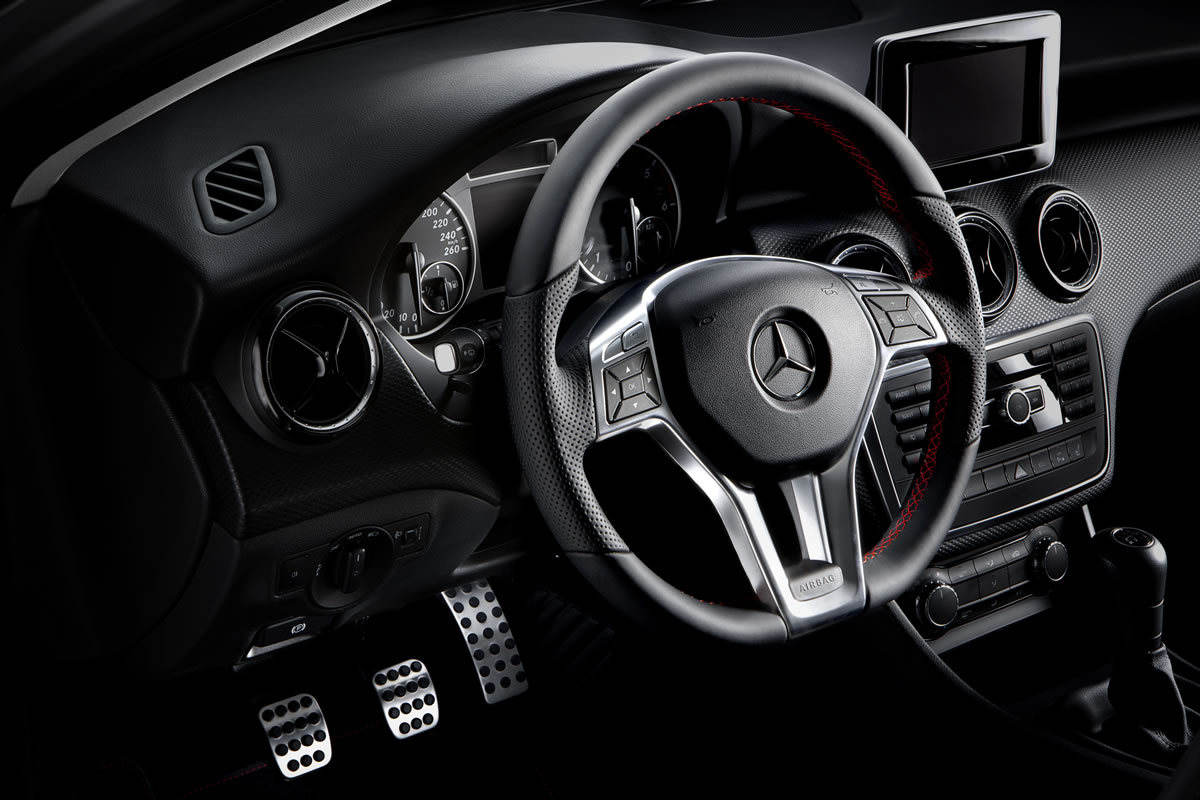The A 45 AMG “Edition 1” stands apart both on a technical level and in terms of appearance. It boasts a fascinating array of exclusive exterior and interior details. The A 45 AMG “Edition 1” focuses on the car’s affinity to motorsport: the exterior paint finish in cirrus white is complemented by AMG sports stripes in matt graphite grey on the bonnet, roof and sides. The red detailing on the radiator grille, exterior mirrors and rear aerofoil leaves a lasting impression. These highlights combine to perfection with the red painted brake callipers and the AMG multi-spoke light-alloy wheels painted in matt black with special AMG hub caps in central-locking look. The 8 x 19 light-alloy wheels are fitted all-round with 235/35 R 19 tyres. Both the AMG Night package and the Aerodynamics package feature as standard on the “Edition 1”, providing the perfect finishing touch to the model’s motorsport-inspired character.