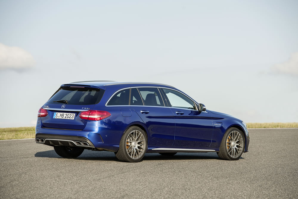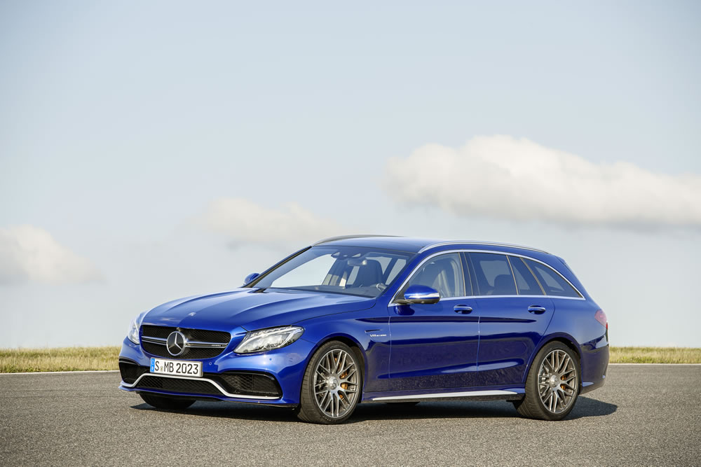 Mercedes C 63 AMG estate in a brilliant blue metallic with AMG Night package, AMG high-performance ceramic composite braking system and heat-insulating dark-tinted glass.