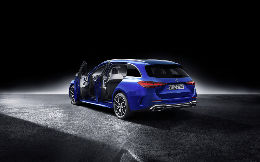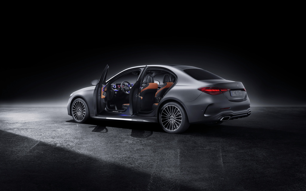 The driver display and media display offer a holistic, aesthetic experience. The look of the screens can be individualised with three display styles (Discreet, Sporty, Classic) and three modes (Navigation, Assistance, Service). In “Sporty”, for example, the colour red is predominant and the central rev counter has a dynamic design. If any of the lines are selected, the new C-Class is equipped with ambient lighting featuring optical fibres as standard.