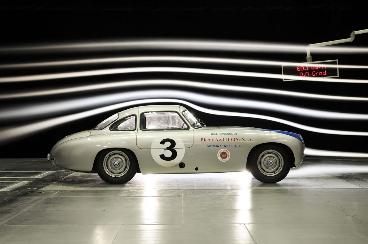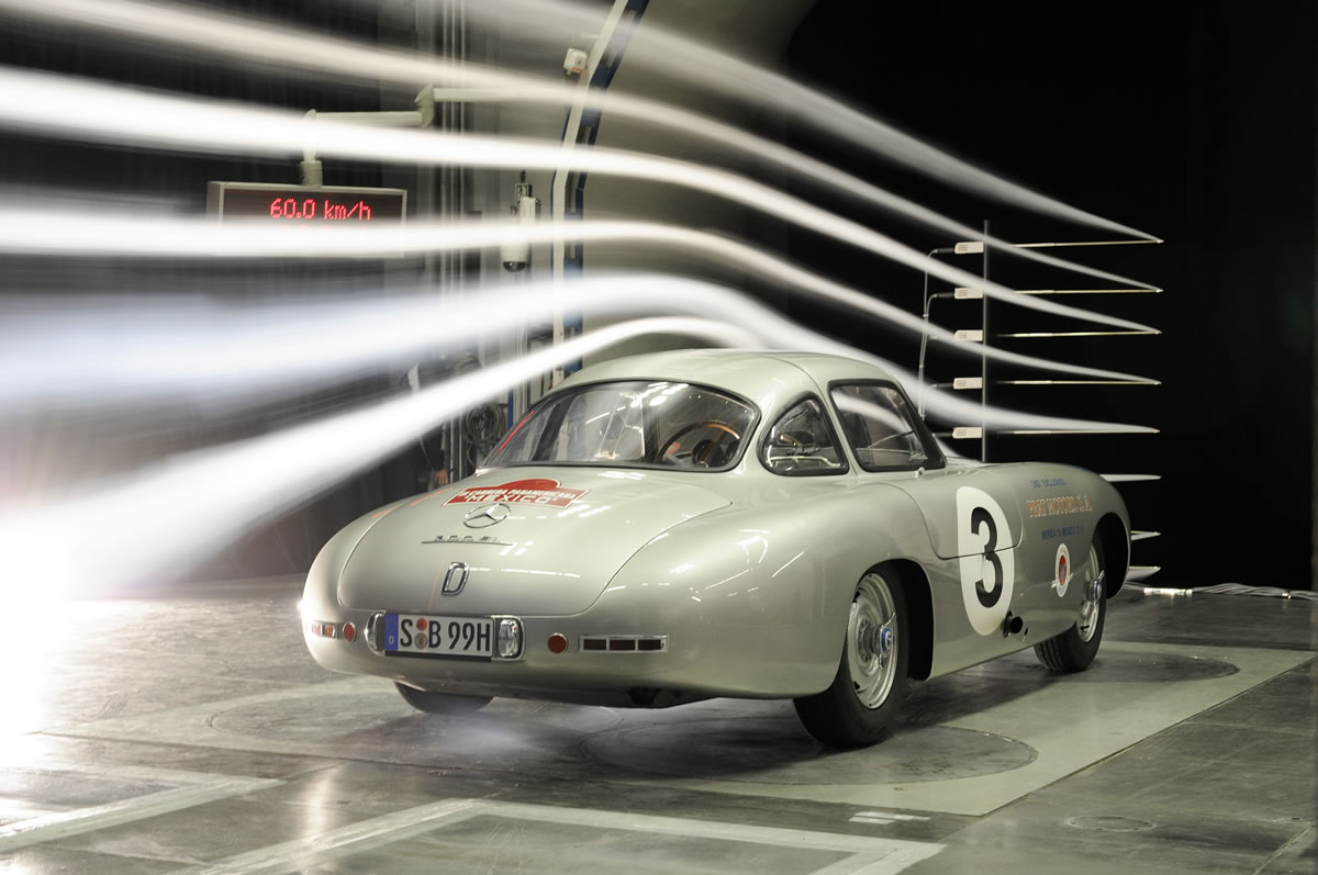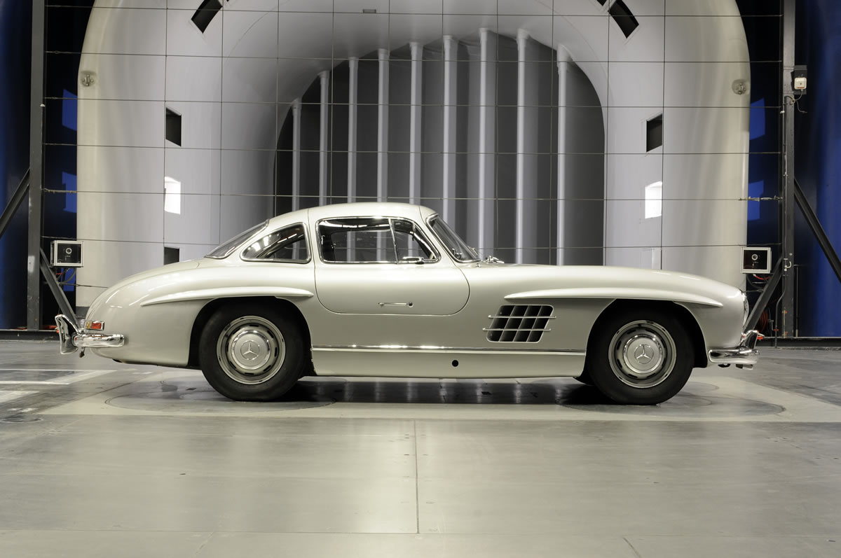 On the other hand in the wind tunnel measurements of today the series-production 300 SL (W 198 I series) held a surprise. With a frontal area of 1.757 square metres the car is even a little more svelte than the 300 SL (W 194 series) of 1952 and can thus – with the cD × A value – partially compensate its cD value which is less favourable than that of the 1952 racing car (W 194 series ). The cD values returned were 0.389 and 0.397, at wind speeds of 130 km/h and 200 km/h, respectively, the resulting cD × A figures, 0.685 and 0.697, respectively.
