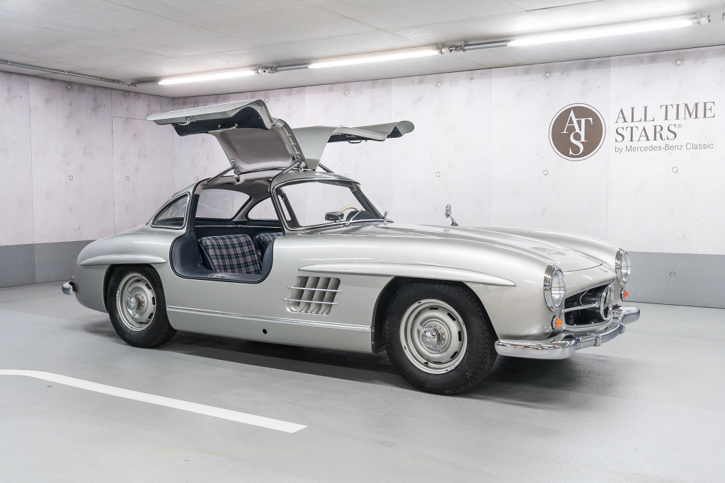 “Gullwing” from 1954 for sale: ALL TIME STARS, the Mercedes-Benz Classic vehicle dealer, is offering a 300 SL from the first months of production in the Parc Fermé in Brescia that sports bolted wing attachments and interior ventilation as features. The rare Rudge wheels are a feature of the special configuration. The classic colour scheme is silver grey (DB 180) with blue chequered seat cover fabric. The vehicle has been owned by Daimler AG since 1990, has an FIA passport and is therefore eligible to participate in such top events as the 1000 Miglia. After extensive partial restoration, it is now a sight to behold and appears “as new”. The machinery inside has been continuously serviced. More information: http://mb4.me/W198