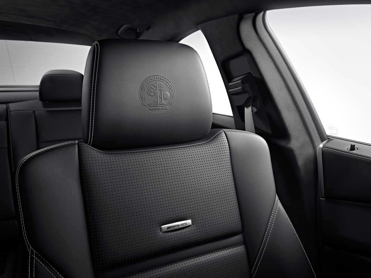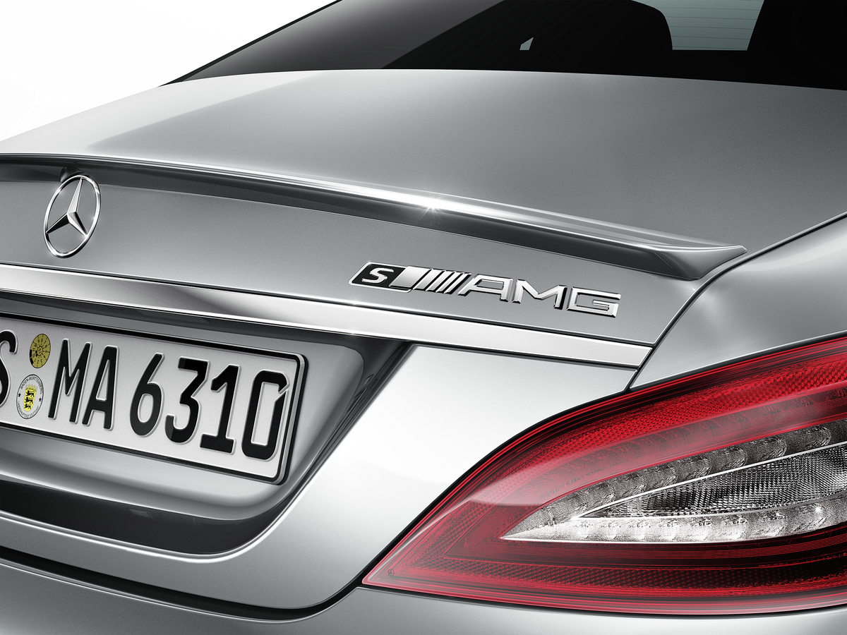 In terms of exterior design, the CLS63 AMG S-Model is distinguished from the other models by red brake calipers and the AMG logo on the trunk lid sporting an “S” in contrasting black. The the standard black Premium leather interior of the S-Model features gray contrasting stitching on the AMG sports seats, the center door panels, the door armrests, the steering wheel, the center console and is accented by silver seat belts. The rim of the AMG Performance steering wheel in black Premium leather is flattened at the top and bottom and boasts grip areas in Alcantara® . The front head restraints of the AMG sports seats exclusively feature the AMG crest embossed directly into the Premium leather. emblems. The AMG instrument cluster has some design cues unique to the S-Model and features an “S AMG” logo on the speedometer that is accompanied by red accents on the dials. Illuminated AMG door sill panels with white backlighting round off the exclusive range of equipment and appointments of the S-Model.