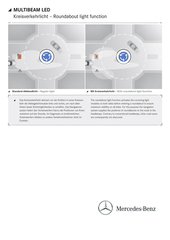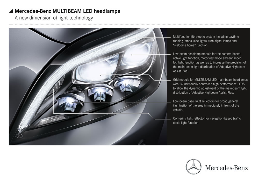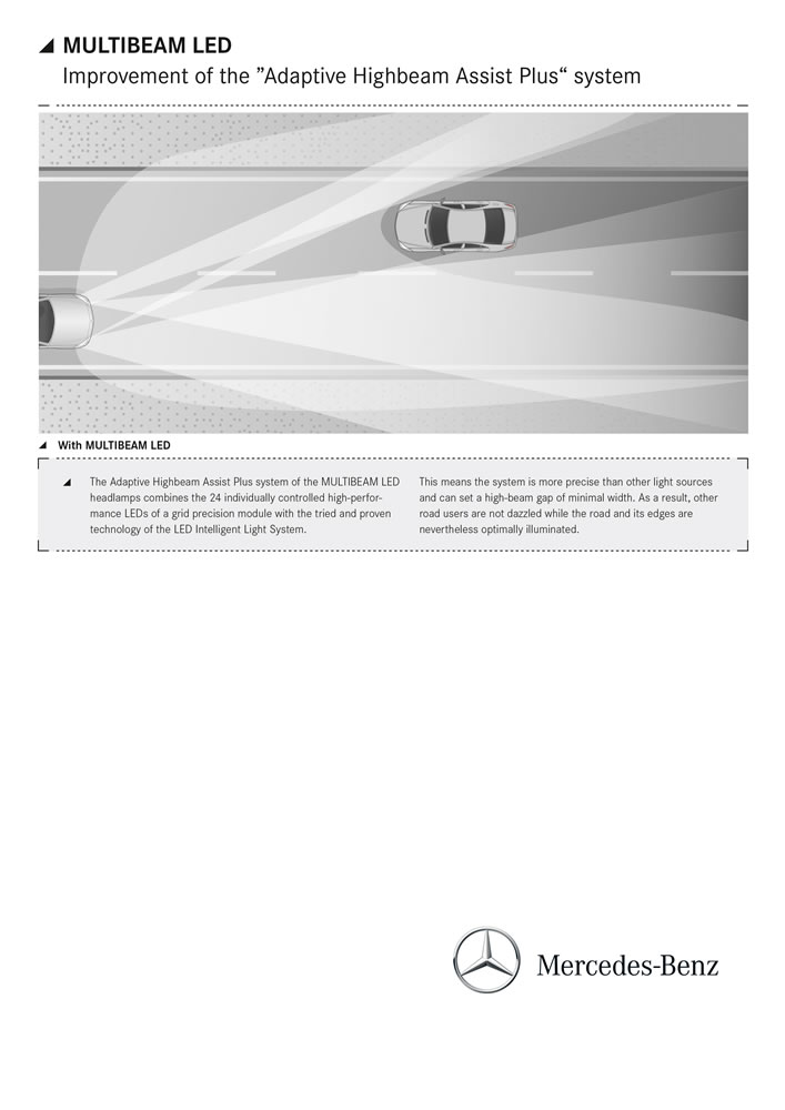 Both models now come as standard with all-LED headlamps in a new design. Alternatively both vehicle models are available as an option with the new MULTIBEAM LED headlamps as designed and developed by Mercedes-Benz. Mercedes-Benz is opening a new chapter in lighting systems with this innovation. Since the MULTIBEAM LED technology combines the very best of today’s lighting technologies and can optimally adjust the light distribution instantly and automatically to virtually any traffic situation, it always ensures thus far unrivalled broad and bright illumination of the road surface and edge of the carriageway for high performance and precision without dazzling other car drivers.