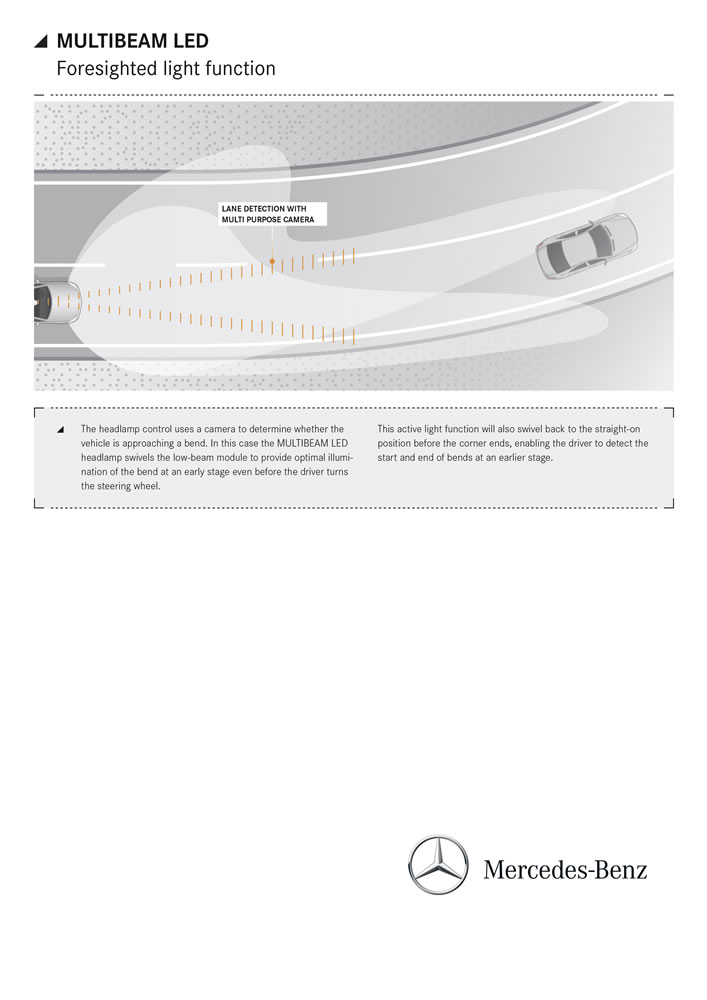As well as the high-performance, precision LED module, each MULTIBEAM LED headlamp also features a module for the low-beam headlamp, which can be swivelled outwards by up to twelve degrees. This provides an active light function, which is also camera-controlled, with unprecedented characteristics. For instance, it offers a preview function which already swivels the active light function when the driver has yet not turned the wheels. Thus it provides optimum illumination of the bend early on. The active light function already swivels back to the straight-ahead position before the end of the bend according to the particular situation. This allows the driver to identify dangers earlier when entering and exiting bends. The anticipatory control allows an additional range of between 30 and 60 metres depending on the traffic situation.