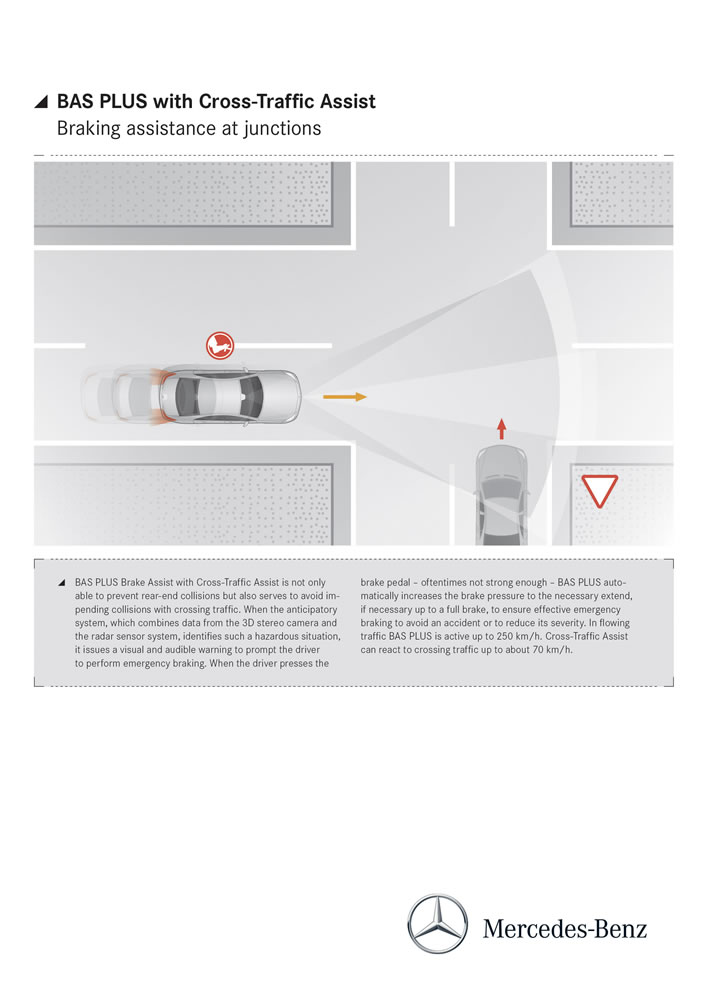 - BAS PLUS with Cross-Traffic Assist – boosts driver braking depending on the situation, if necessary up to full brake application and, for the first time, can also react to crossing traffic and pedestrians.
