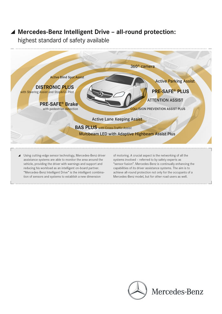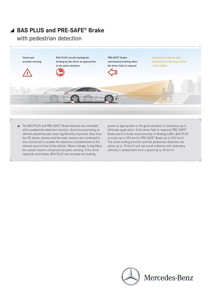 - PRE-SAFE® Brake with pedestrian detection – provides autonomous braking in the absence of a driver reaction. In typical urban driving scenarios, it can now prevent collisions with pedestrians or stationary vehicles or reduce their severity.
