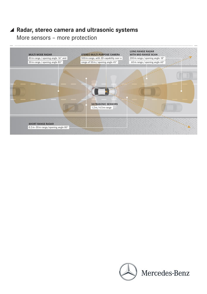 The basis for the numerous functions of the assistance systems is an extensive sensor system, which can provide the vehicle with a 360-degree view. Depending on the vehicle’s equipment, for example, a Stereo Multi Purpose Camera (SMPC) may be included behind the windscreen near the interior mirror. Two camera eyes provide it with a three-dimensional view of the area up to around 50 metres in front of the vehicle, and it is able to monitor the overall situation ahead for a range of up to 500 metres and thus determine the position and movement of objects, especially of vehicles and pedestrians.