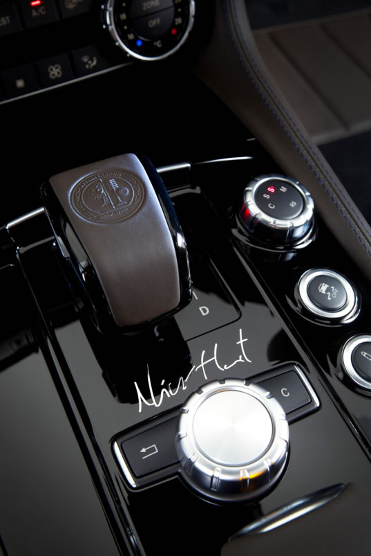 On the inside, Spencer Hart drew inspiration from its flagship store in Brooke Street, particularly the walnut paneled personal shopping area, dubbed “The Vault”. The AMG Shooting Brake interior is fitted with dark Chocolate Brown Italian leather seats with contrasting Midnight Blue stitching and the Spencer Hart logo on each headrest and Nick Hart’s signature on the center console.