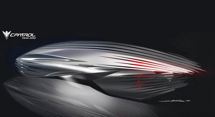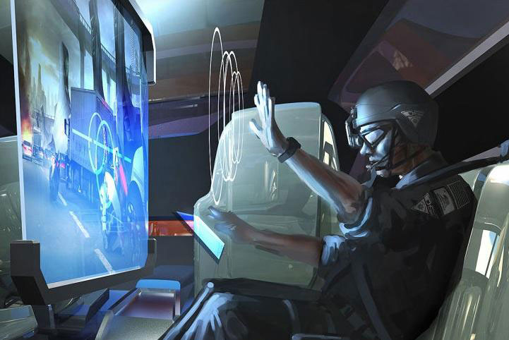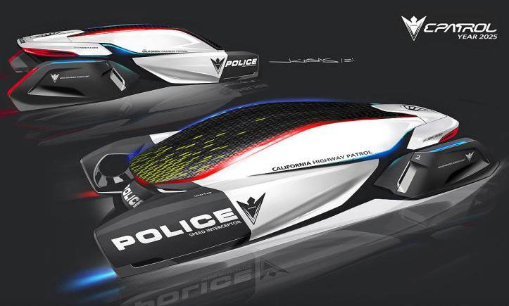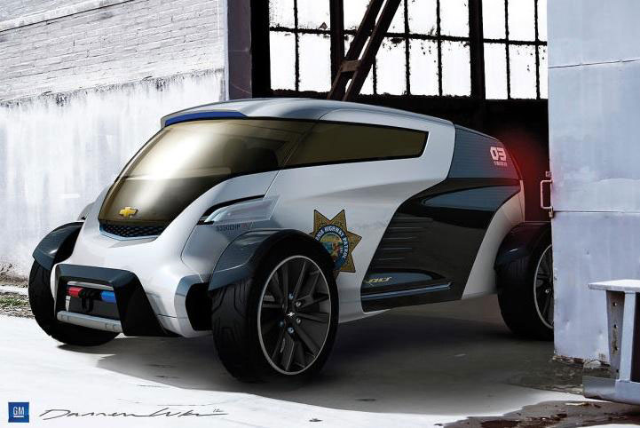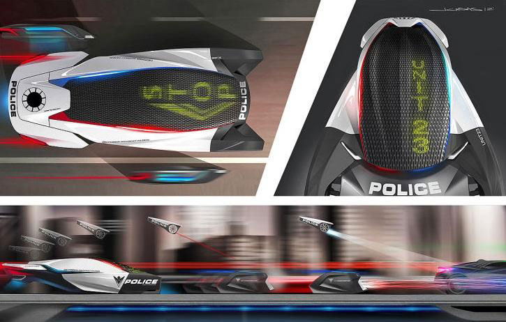The BMW Group DesignworksUSA team chose Los Angeles as the region to create a 2025 scenario for the E-Patrol (Human-Drone Pursuit Vehicle). Their research predicted that Los Angeles would have more traffic, faster vehicles, and vehicles with alternative fuel sources. The design centered on a modular structure and drone technology that enhanced both teamwork and accessibility. The main structure can deploy three drones. In the case of a pursuit during heavy traffic areas, the patrol officer sitting in the two passenger main structure can deploy either the flying drone or one of the single wheel drones to chase the suspect and report back data to the main structure.