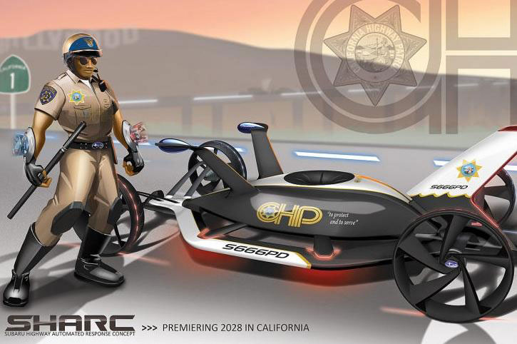 With the grand opening of Hawaii’s sparkling new inter-island Paradise Highway, Subaru debuts the cutting-edge SHARC (Subaru Highway Automated Response Concept). SHARC highway patrol vehicles will provide an innovative, affordable, and environmentally conscious solution for 24-hour highway monitoring, protection, and rapid emergency response. Meeting Hawaii’s strict UltraGreen carbon-neutral environmental regulations and reflecting a trend for reduced highway patrol budgets worldwide, zero-emission SHARC vehicles are powered by renewable energy and operate autonomously, eliminating the need for a large full-time highway patrol staff.