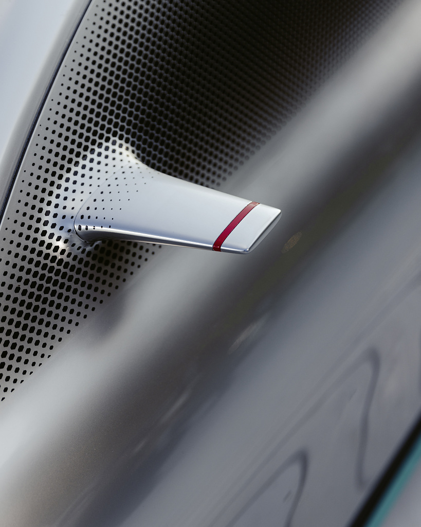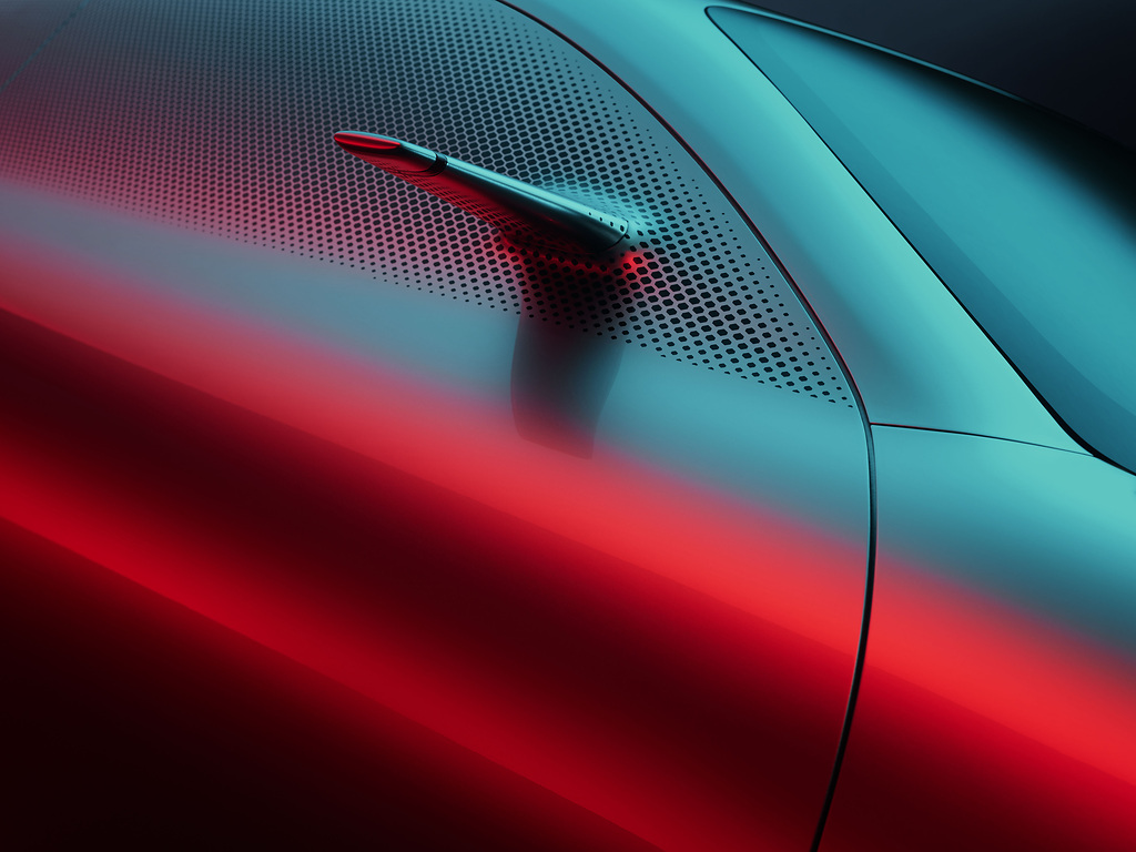 The AMG-specific grille with vertical bars is retained as a distinctive brand feature – despite the fact that an all-electric drivetrain does not require a classic radiator at the front. The high-tech development of the grille is therefore closed off, painted in body colour and fully integrated into the front end. As the visual focal point, the grille emphasises the futuristic look of the Vision AMG with its illuminated bars and three-dimensional exterior contour. The three-pointed star is positioned prominently on the bonnet – as on the Mercedes‑AMG Project ONE.