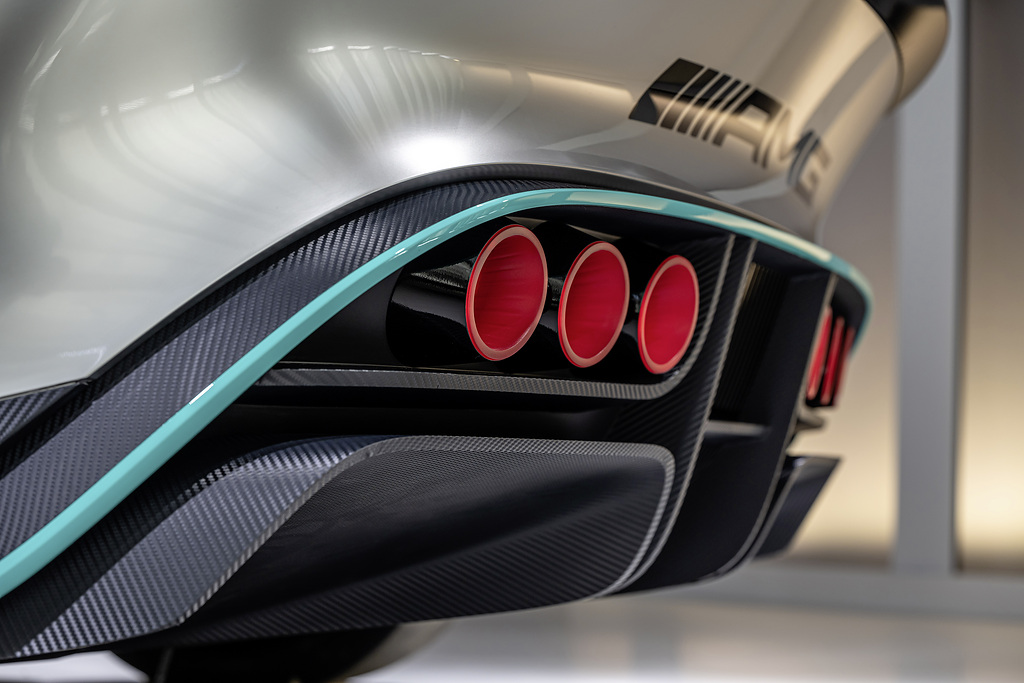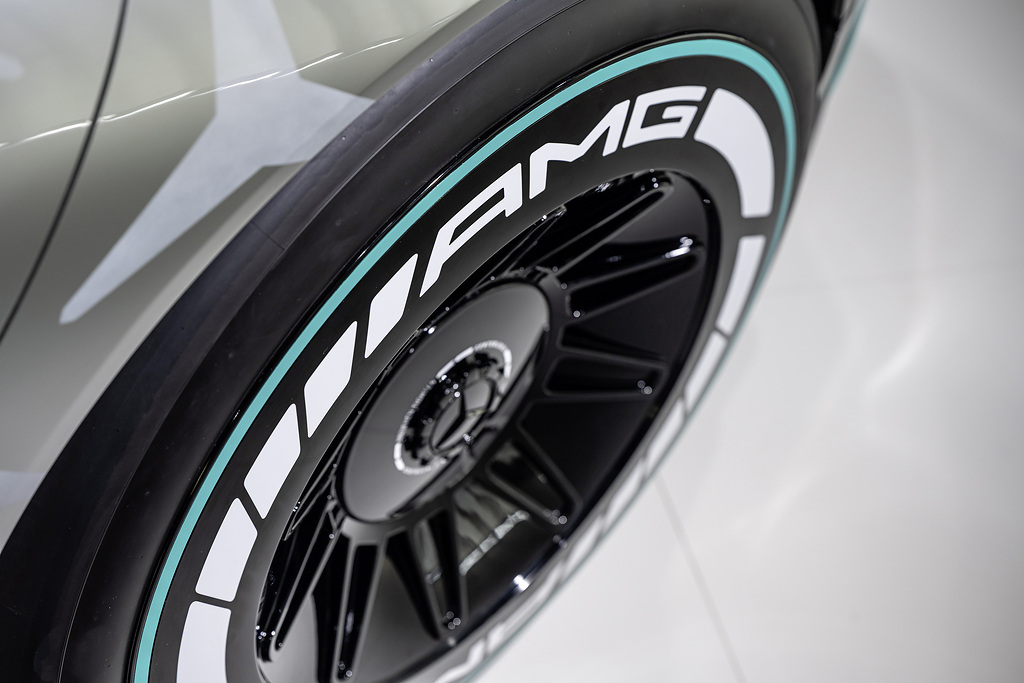 The direct connection to the successful Mercedes-AMG Petronas F1 team is evident in further visual details. These include the silver paintwork with a large-format star pattern across the shoulders and rear wings, functional elements in exposed carbon-fibre, the aerodynamic design of the 22-inch wheels with aero claddings, the AMG logo and elements on the sills and diffuser in the Petronas colours.