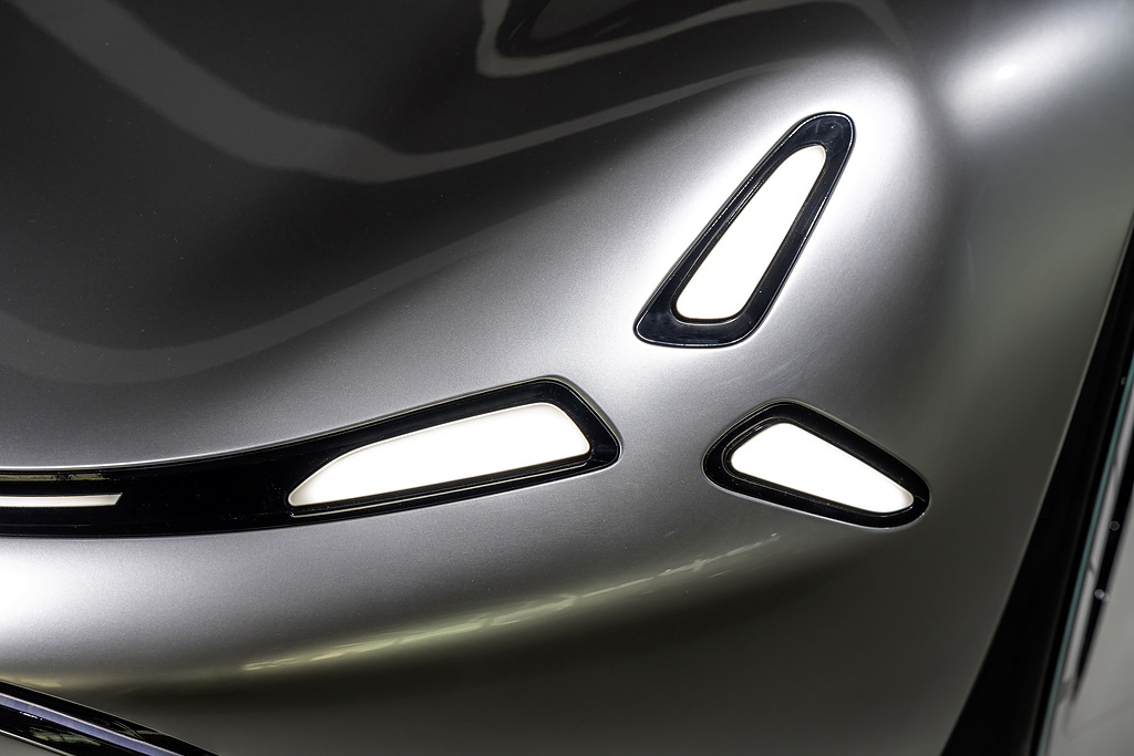 The graceful greenhouse is integrated into the flowing overall form and blends seamlessly into the low-lying silhouette. The roof tapers as its line drops elegantly towards the rear, flowing directly into the rear spoiler. The overall effect is a visually fascinating and aerodynamically advantageous teardrop form, not unlike that of the VISION EQXX. The sensual surfacing and the powerfully defined sculpture are representative of the hallmark Mercedes design language. Similarly, the brand’s aspiration to the extraordinary is realised through the radical proportions and sharply chiselled shark nose. The Vision AMG is thus an impressive example of the dual polarity of the brand’s design approach embracing “Beauty & the Extraordinary”.