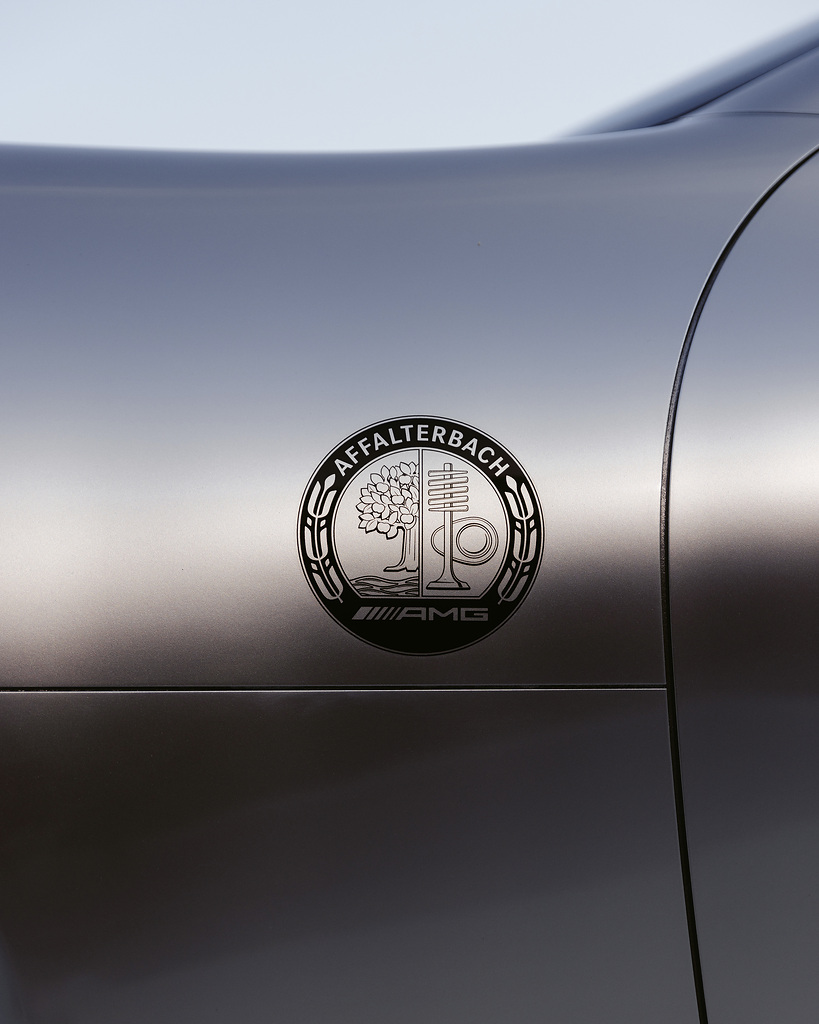 The sharply angled tear-off edge at the rear incorporates an active spoiler, elongating the side view while at the same time improving the aerodynamics. It is framed by a precisely cut band of light that accommodates a variety of different light installations, providing an effective contrast with the large black AMG logo on the rear of the car.