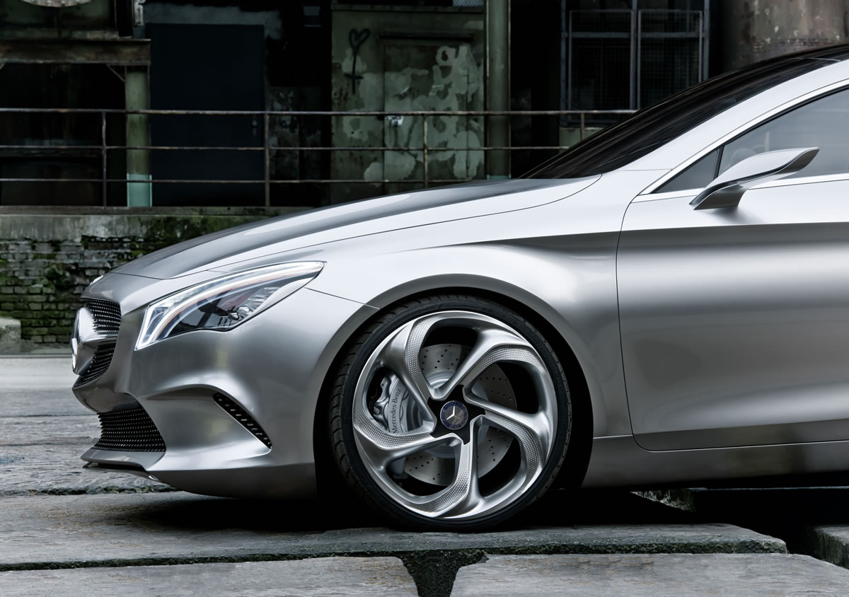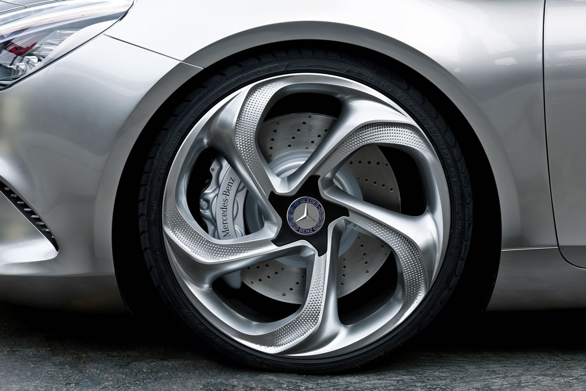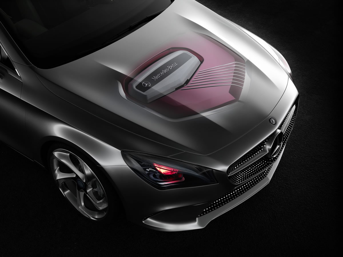 Among its most striking features is the way the hood, with its powerdomes, is set right into the front end assembly, as well as its diamond-look grille, which follows through on design cues set by the Concept A-CLASS. The paint finish of the concept vehicle is in Alubeam – a color that helps to emphasize the sculptural quality of its lines.