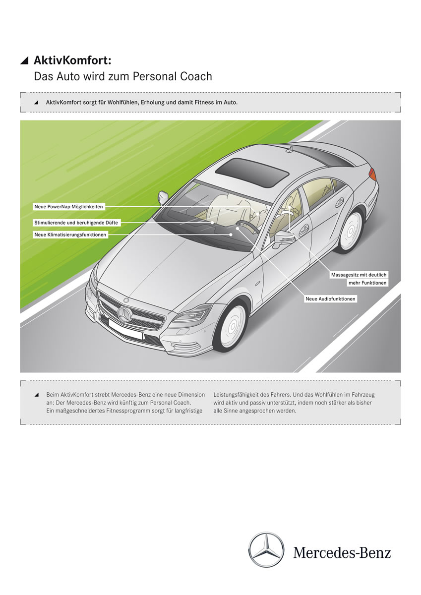 More and more, people are spending ever more time in cars. At the same time, health care and health insurance expenditure is rising and the wellness market is booming. The Germans alone spend around 70 billion euros on wellness annually. In future, “star treatment” from Mercedes-Benz will attend to all on‑the-road wellness needs.