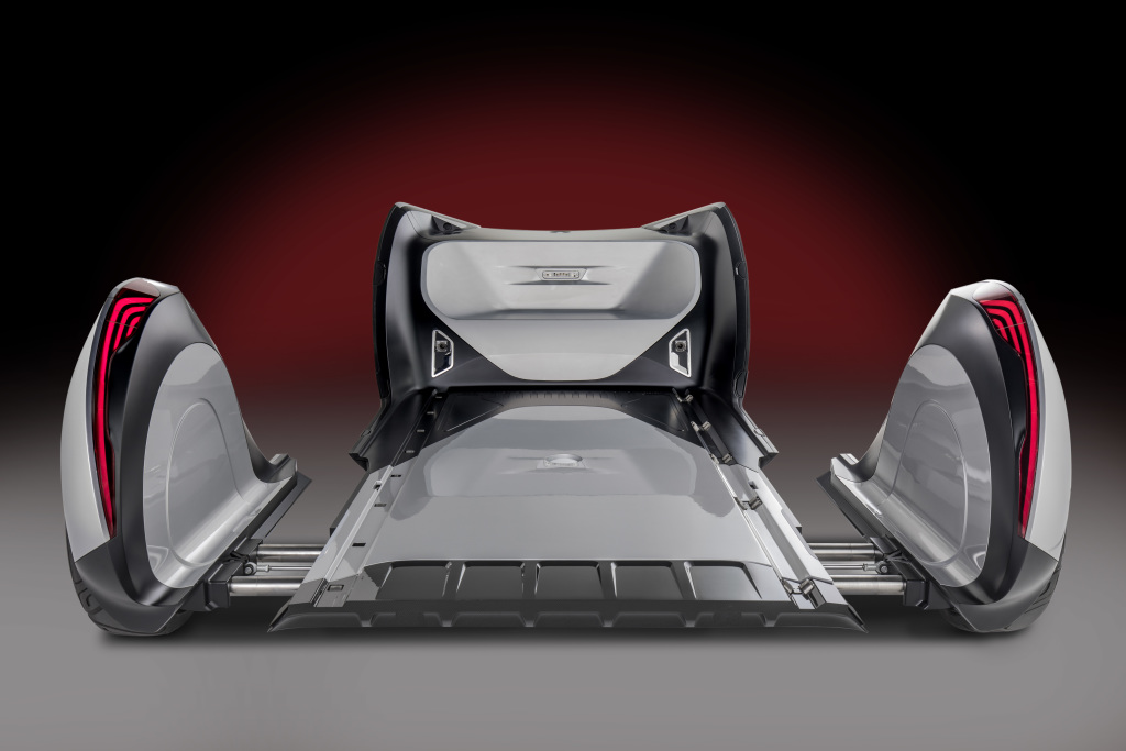 The cargo module serves as a classic goods transporter. Thanks to its variable load floor, it can be divided into two levels and transport up to ten EPAL palettes. The load space has a volume of 10 m3. Alternatively, the vehicle can be fitted with fully automated cargo-space systems and used as a mobile package station for last-mile deliveries. Multiple further use cases are also conceivable as the concept can be equipped with a wide array of bodies for other sectors and applications.