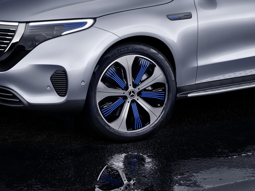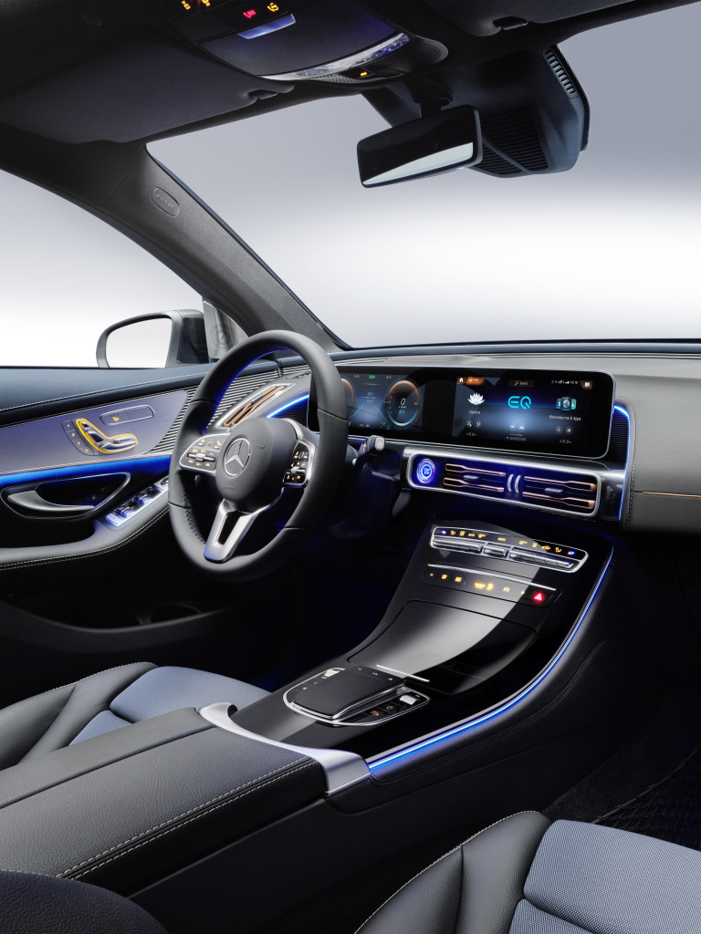 Mercedes-Benz EQC 400 4MATIC, (BR N293) / hightech silver / Interior: Electric Art / The new Mercedes-Benz EQC – the first Mercedes-Benz under the product and technology brand EQ. With its seamless, clear design, the EQC is a pioneer for an avant-garde electric look with trailblazing design details and colour highlights typical of the brand both inside and out.;combined power consumption: 22.2 kWh/100 km; combined CO2 emissions: 0 g/km*, provisional figures