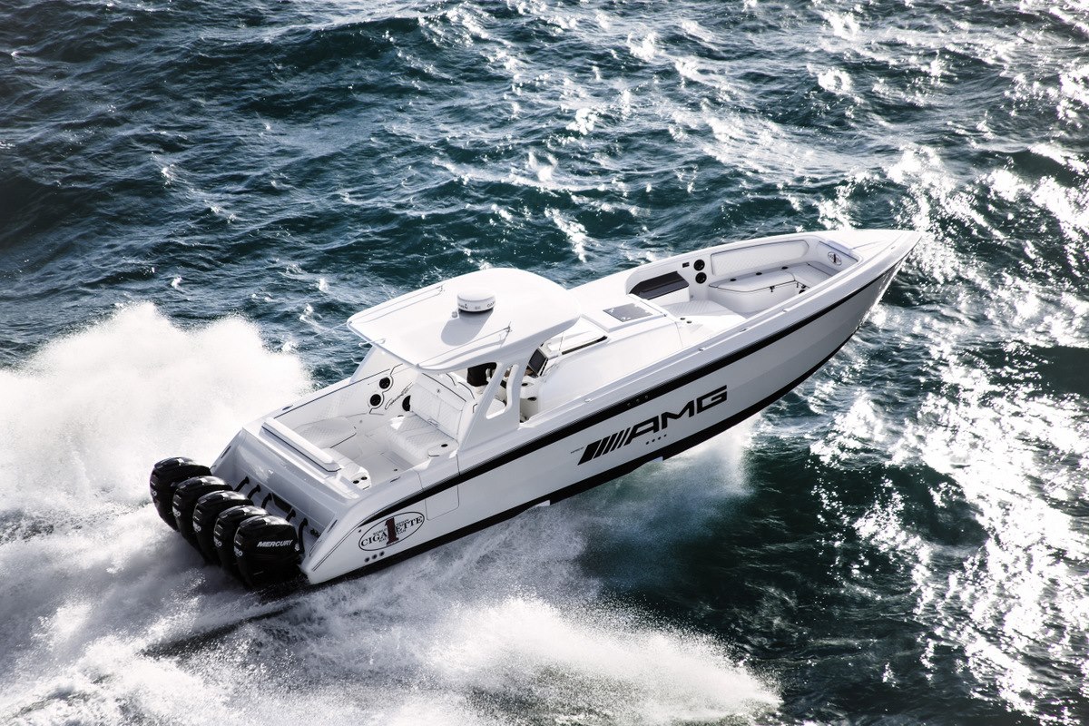 The Cigarette 42 Huntress, Inspired by AMG has five engines a top speed of more than 75 MPH, is inspired by the G 63 AMG and is the 3rd collaboration between the Cigarette Racing Team and Mercedes-AMG. It does not get much better than this.