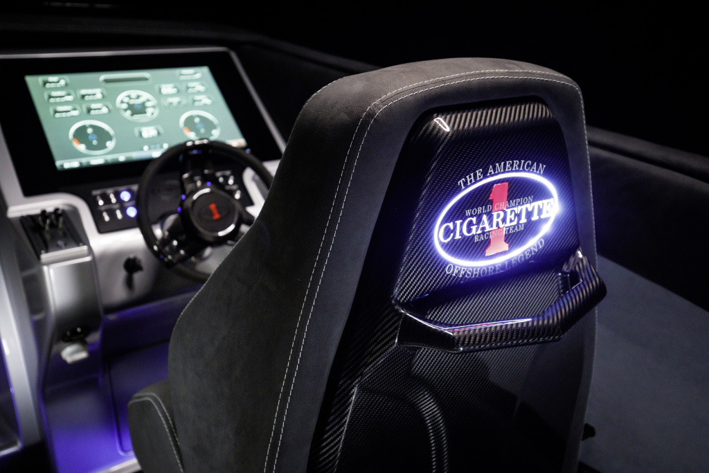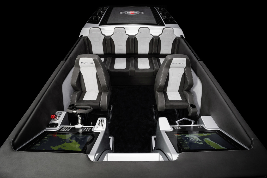 The Cigarette Racing Team worked in close cooperation with Gorden Wagener, Chief Design Officer for Daimler AG, to design the hallmark characteristics of the boat. The distinctive matte black and silver paint and special badging instantly evoke the unmistakable Mercedes-AMG Project ONE. This attention to every detail extends inside the cabin with extensive use of Dinamica and seatbacks constructed of exposed-weave carbon fiber.