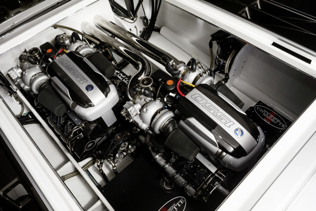 The Cigarette Racing Team 515 Project ONE is powered by a pair of Mercury Racing 1,350/1,550 QC4v (Quad Cam 4 Valve) engines and M8 stern drives, delivering up to 3,100 hp.