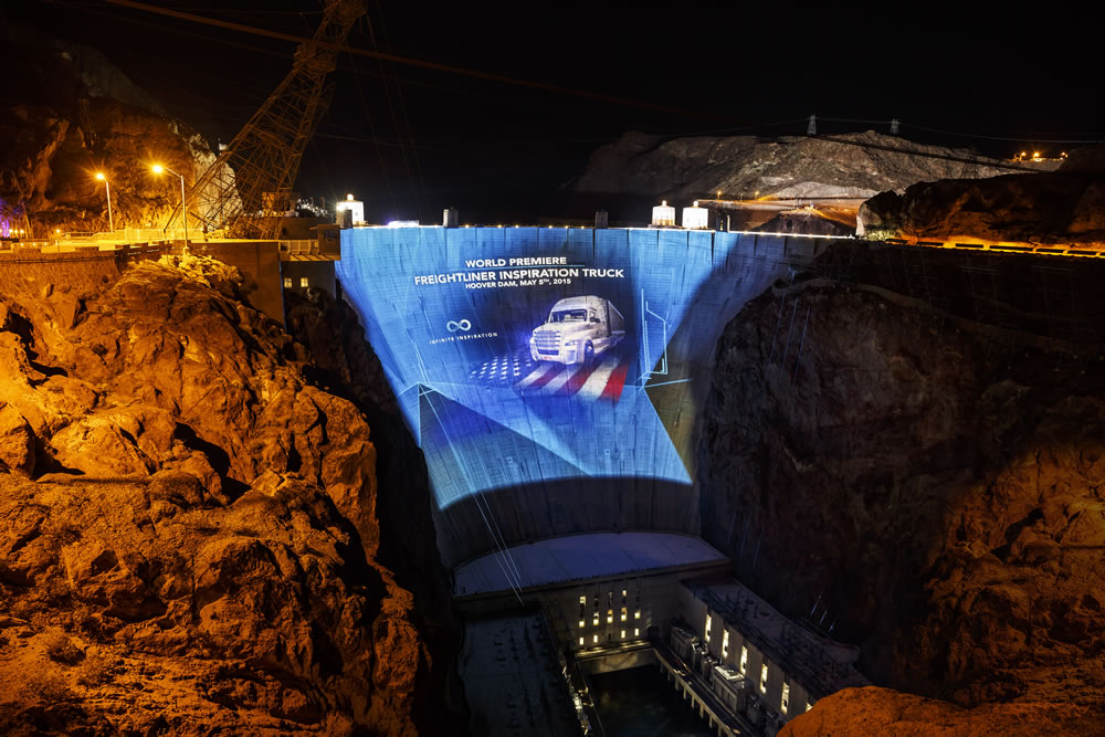 Almost 80 years after its official opening, the famous Hoover Dam was the setting for the World Premiere of the Freightliner Inspiration Truck. Doing double duty holding back trillion gallons of water and generating electricity for Las Vegas and California, the dam served as the largest projection screen ever in North America – something that has never been done before. This projection – at 1.17 million lumens – earned Freightliner the GUINNESS WORLD RECORDS title of Highest light output projection and, with the Freightliner Inspiration Truck, Daimler introduced the world’s first autonomous truck licensed to drive on public roads at the historic concrete arch-gravity dam in southeastern Nevada.