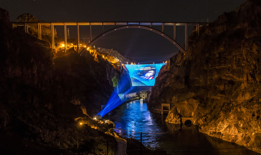 To give this historic event a fitting, monumental backdrop, 60 projectors at 26,000 watts each projected the 30-minute presentation that introduced the Inspiration Truck. In a spectacular finish of the reveal, the truck drove onto the Hoover Dam in the desert of Nevada. This unique video screening was projected onto a surface of a little over 420,000 square feet. This is equal to almost nine football fields and over 87 average-size IMAX screens.