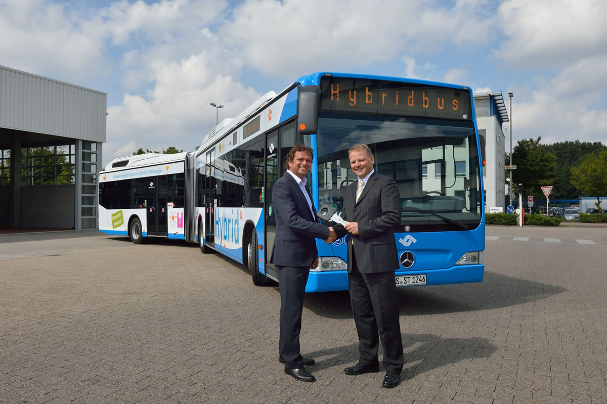 In the fuel cell bus category, the Citaro FuelCELL Hybrid won the EBUS Award, the environmental award for public local transport. Roman Biondi, brand spokesman for Mercedes-Benz buses and EvoBus, and Ulrich Piotrowski, the Market Launch Manager for Mercedes-Benz hybrid and electric buses, accepted the award in Cologne on September 28, 2012 from Professor Ralph Pütz of the Landshut University of Applied Sciences, in the presence of Rainer Bomba, State Secretary at the Federal Ministry of Transport, Building and Urban Development.