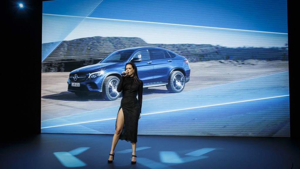 Mercedes-Benz at the 2016 New York International Auto Show. The german singer Grace Capristo, presenting her new song “One woman army” on the world premiere of the new GLC Coupé at the New York International Auto Show