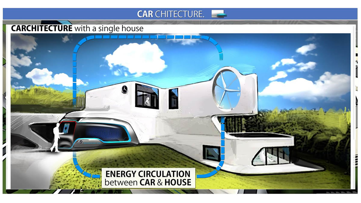 This is where ‘Carchitecture’ comes in. Developing car design so that they can incorporate mobile and immobile elements could prove a worthwhile strategy in future. The link between a house and a car is energy: the energy flow is made possible through electric power in cars and the intelligence of energy houses in the future. The connection between the house and car is symbiotic in nature: the car is an energy accumulator on wheels, the house is a supplier and receiver of energy. So, in future, an electric vehicle could replace the installed heating system for a building.