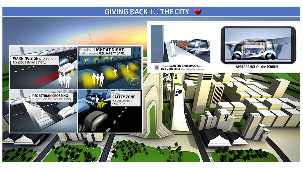 The idea of ‘Giving Back to the City’ came about because of the way people perceive cars which are often seen as the ‘bad guys’ – for example when it comes to parking. Thus, the task was: how can we create a more positive perception of cars? What additional functions must cars have in order to offer people benefits above and beyond transportation? There is no doubt that cars are becoming more and more intelligent – they are fitted with a vast amount of sensory systems and technology. ‘Giving Back to the City’ is a philanthropic approach that aims to use these technologies to create benefits for the wider community.