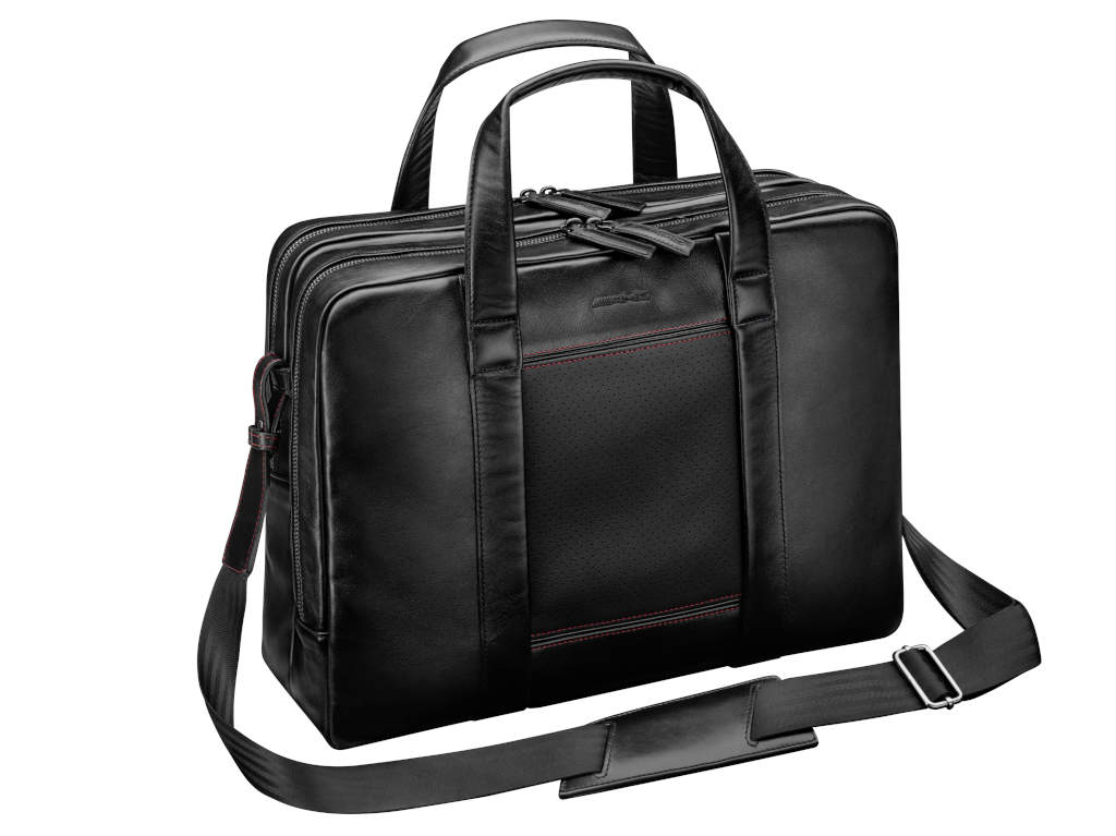 There’s plenty of space for larger items and business documents in the new, black business bag made of perforated leather. With its red contrasting topstitching, it not only scores highly in terms of first-class design, it’s equally impressive when it comes to practicality and comfort. The bag features a large zipped main compartment and various inner compartments. There is also a padded laptop compartment for devices up to 38.1 cm (15 inches) plus a large compartment with a magnetic fastener. The leather loop on the back which can be used for hanging the bag over the towbar of a trolley suitcase and the padded, length-adjustable shoulder strap round-off the features of this business bag.