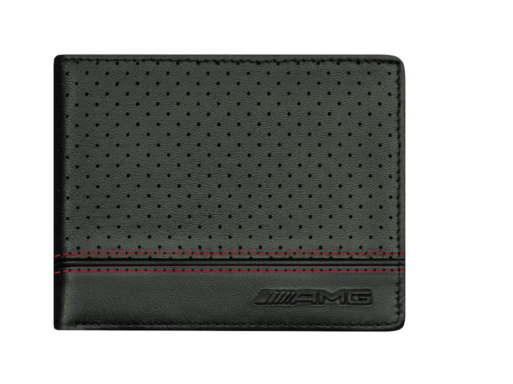 The smartphone cover in genuine lamb’s leather is particularly refined. Based on the design of the AMG seats, the black cover features an on-trend perforated look. The leather-trimmed click-in holder makes it easy to insert and remove the mobile phone. Various compartments available for cards and notes round-off the impressive features of this handmade cover. The new wallet, likewise in high-quality perforated lamb’s leather, has a matching design. Red contrasting topstitching and an embossed AMG logo add attractive highlights and round off the harmonious design. Inside there are two note compartments, four credit card slots, three larger compartments for a vehicle document, ID card, etc. and a coin compartment with press-stud fastening.