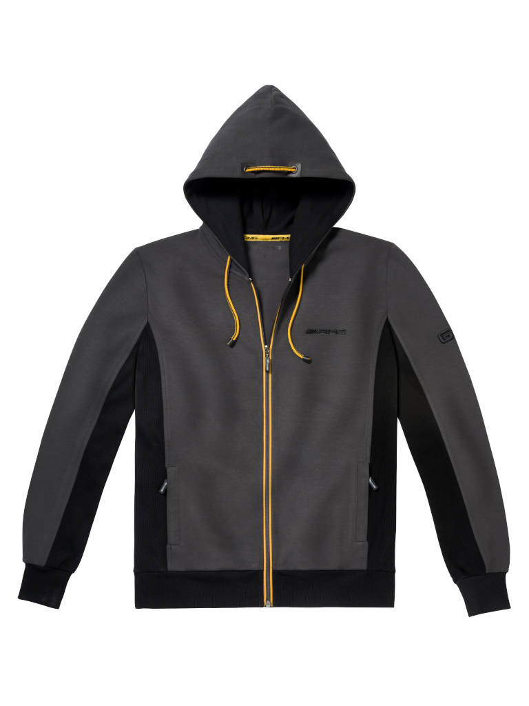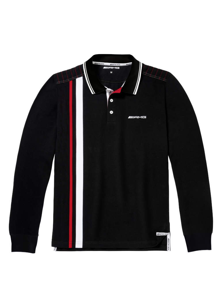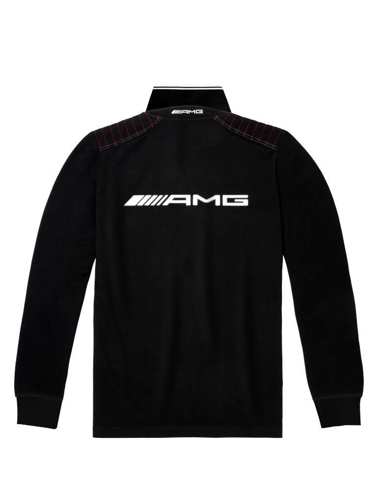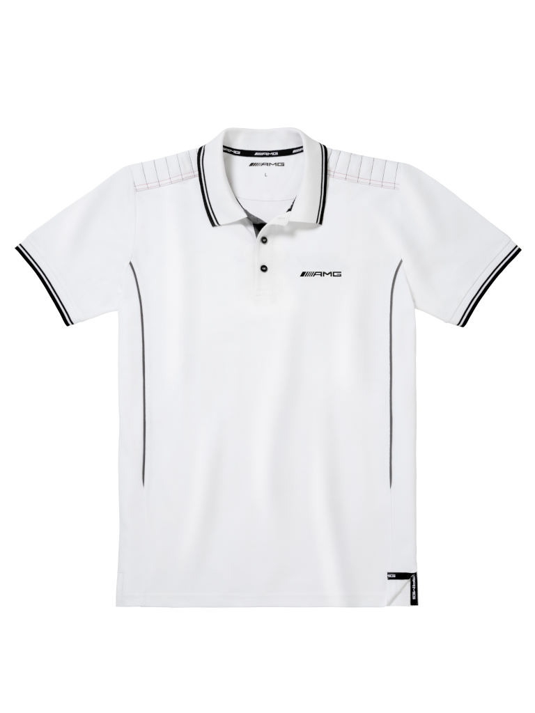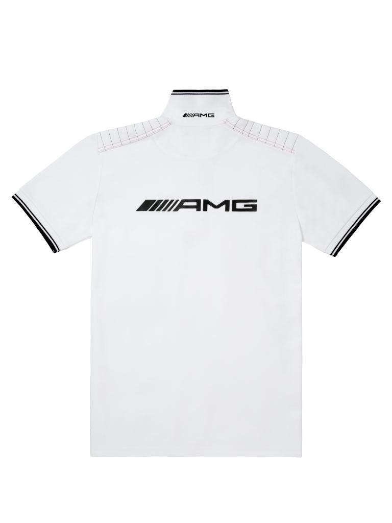 The versatile men’s sweat jacket in selenite grey with yellow highlights available in S to XXL is understated yet sporty. Designed with a tapered slim-fit cut, the jacket is made of 73% cotton / 27% polyester. The zip in contrasting solarbeam yellow closes the jacket securely, while two pockets provide a secure space to keep small essentials. The jacket is completed perfectly by a drawstring hood, matt black eyelets and a two-tone cord plus black ribbed cuffs and hem. Visual highlights are the black 3D-embroidered logo on the left breast, the 3D-embroidered “GT” on the sleeve and the yellow collar with woven AMG logo. Likewise new to the collection are two men’s polo shirts: a long-sleeved shirt in base colour black with white and red highlights, and a short-sleeved shirt in white with black highlights. Made of 100% cotton, they are available in sizes S – XXL.