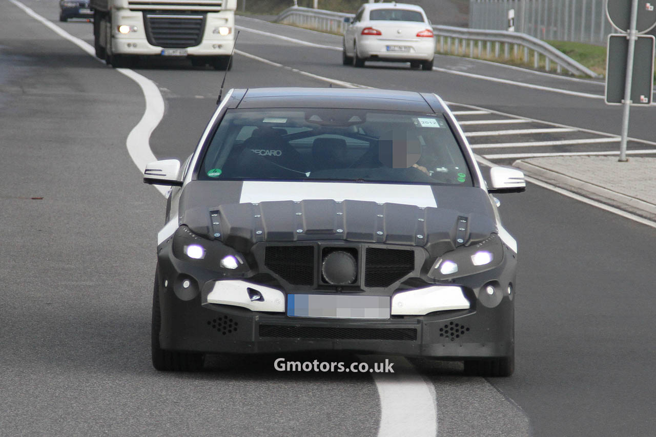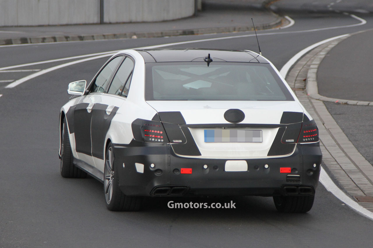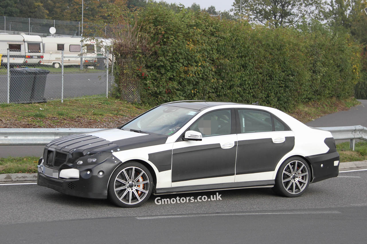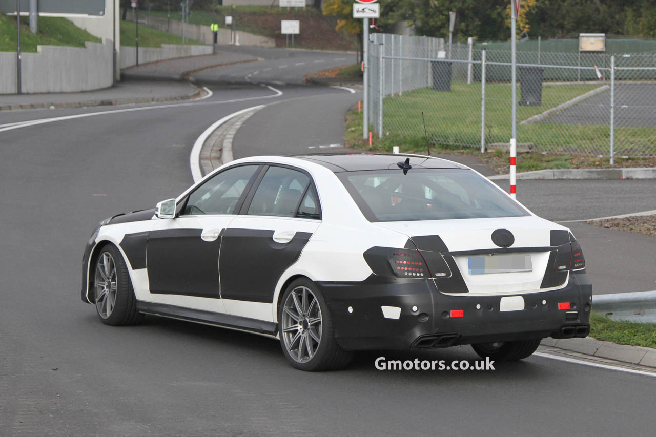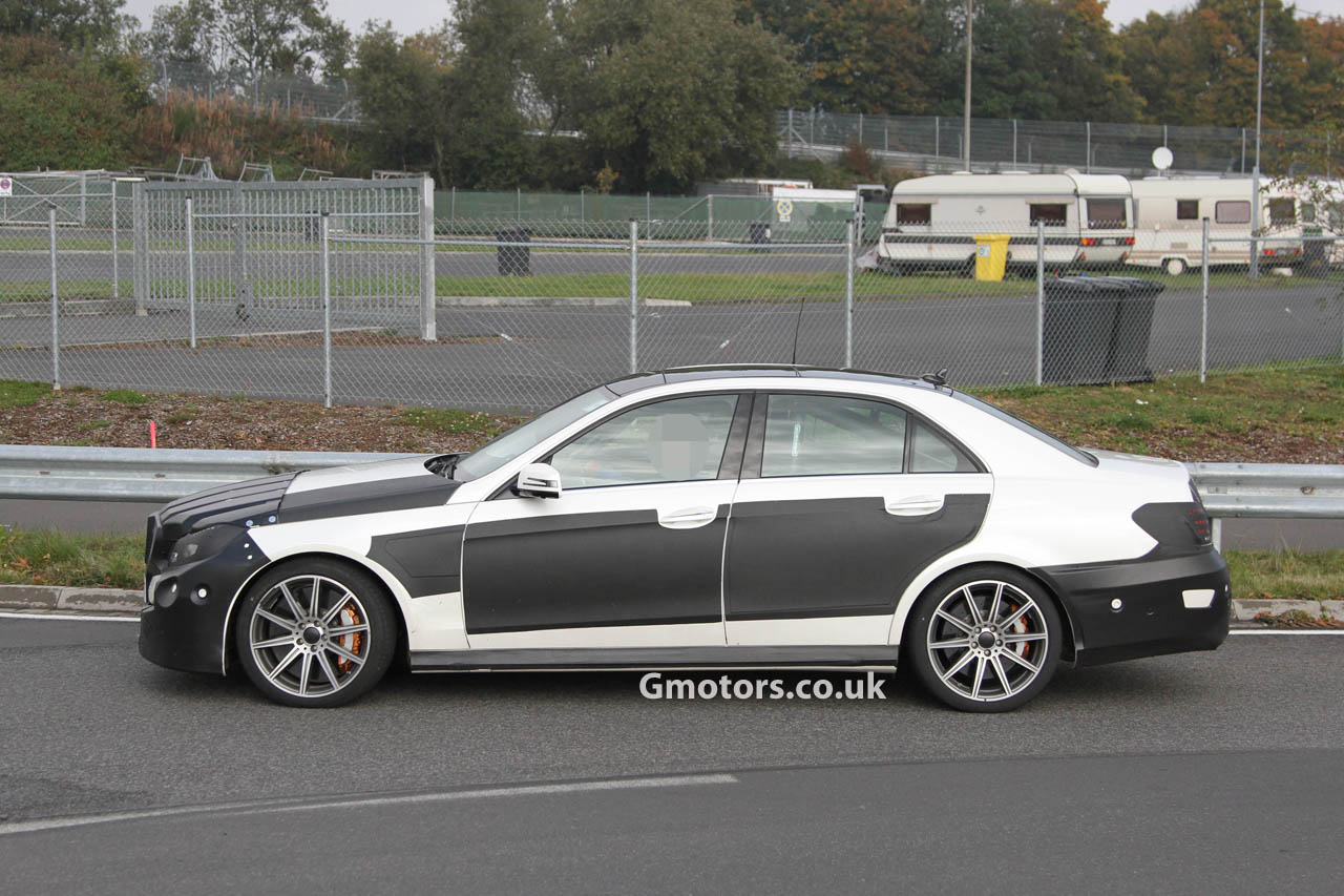 Testing near the Nürburgring, the Mercedes E63 AMG has a well disguised front bumper, but we are able to see single headlamp units with LED running light at the top.