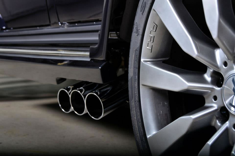 Lastly on the exterior is an A.R.T. roof spoiler with LED wideboard brake light and blend in stainless steel, monoART1 wheels in size 22×10, coated matching to the striking color concept, with tires in size 295/35 R22 and a sport exhaust system in stainless steel, with three end pipes per side.