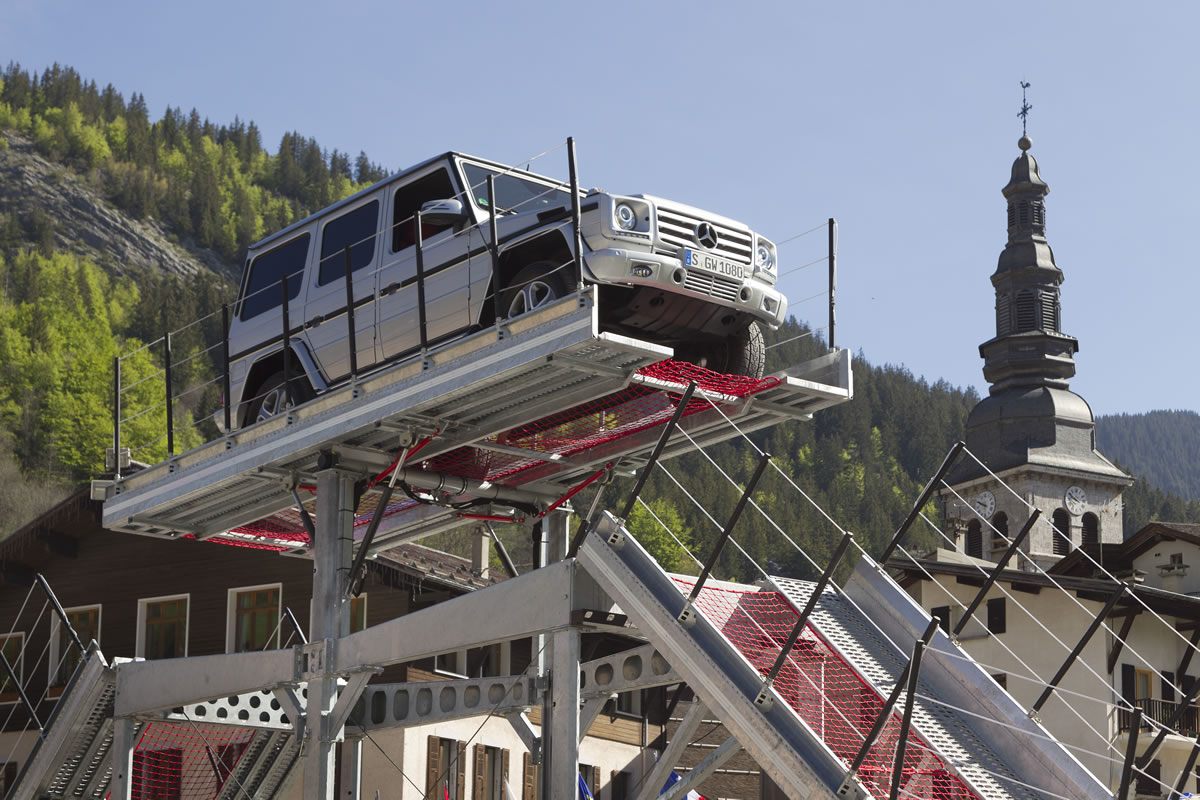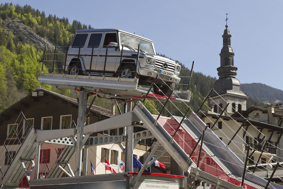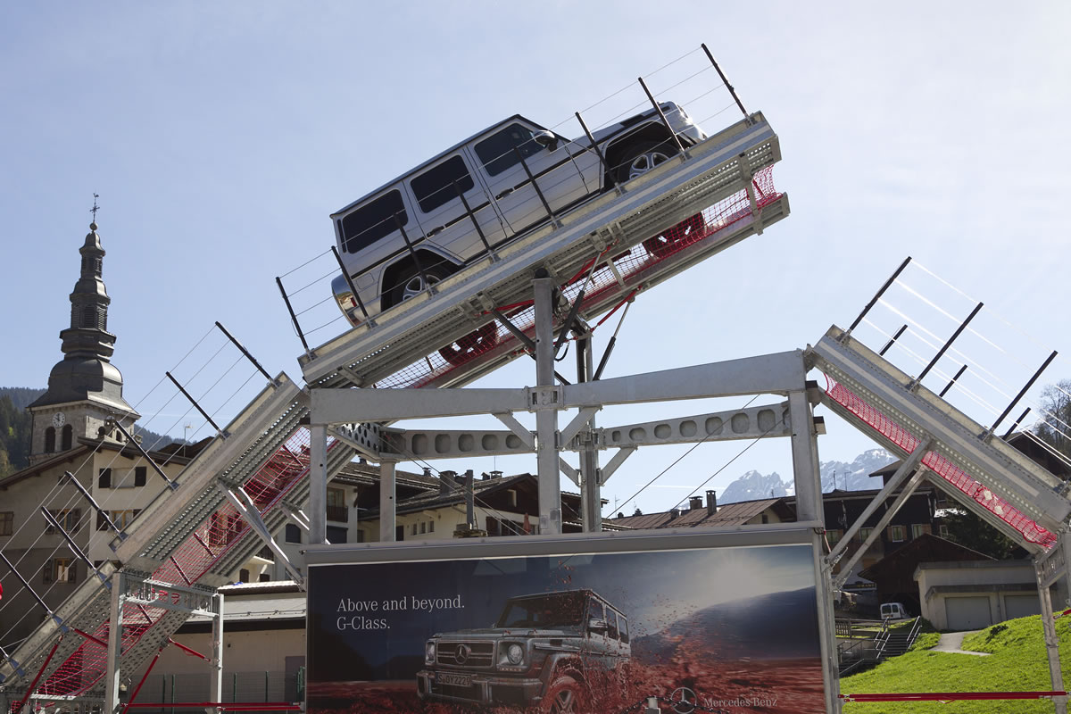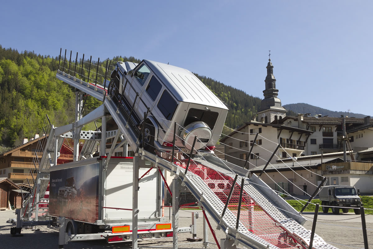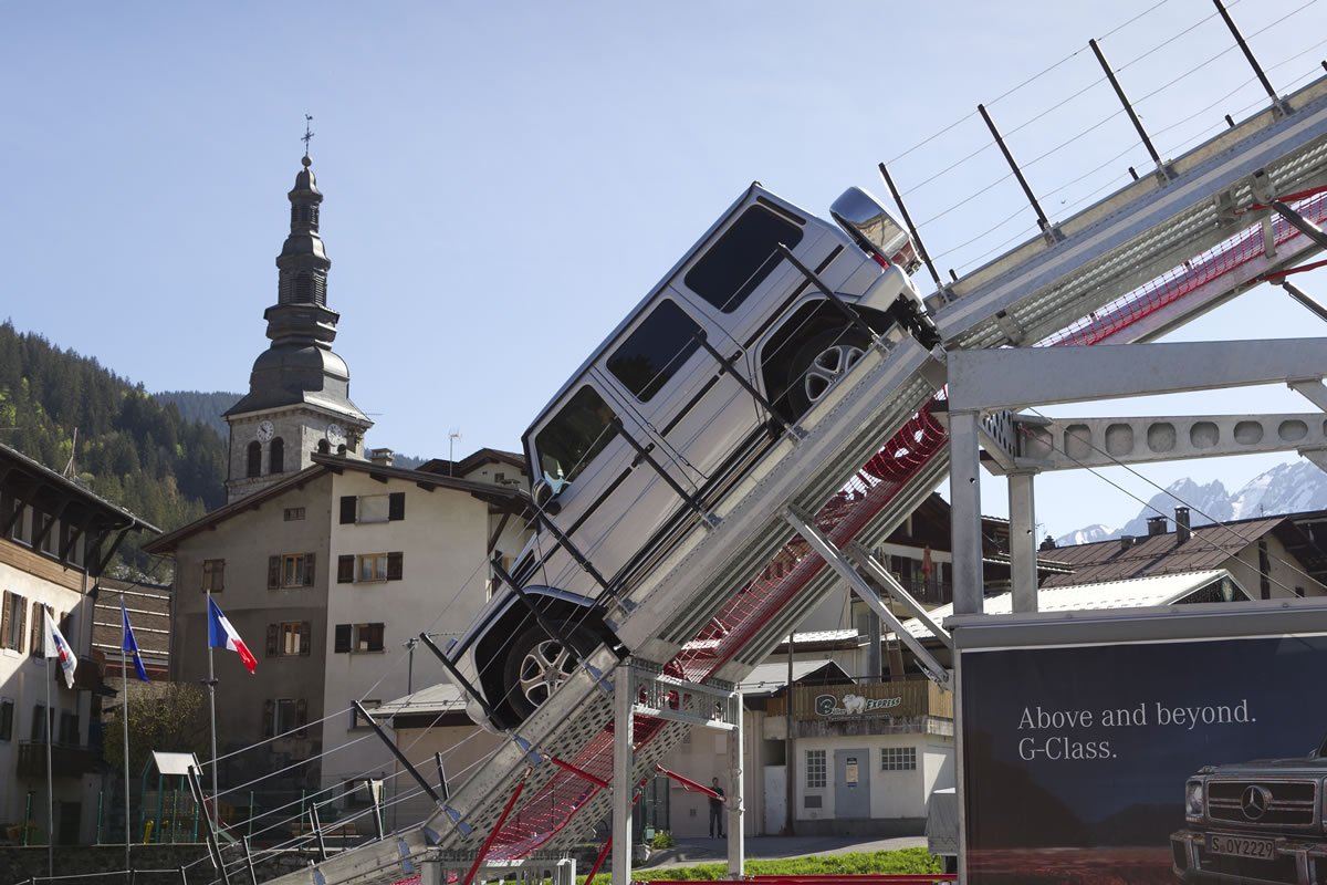 Enter “The Iron Schöckl”. Named after the Schöckl, a mountain near the Graz plant in Austria where the Mercedes G-Class is tested year round, the man-made Iron Schöckl challenges the Mercedes G-Class by forcing it to undertake a 100% climb (i.e., a 45 degree incline). Then, at the top, the G-Class enters a movable platform, teeters to point downward, and undertakes a 45 degree descent.